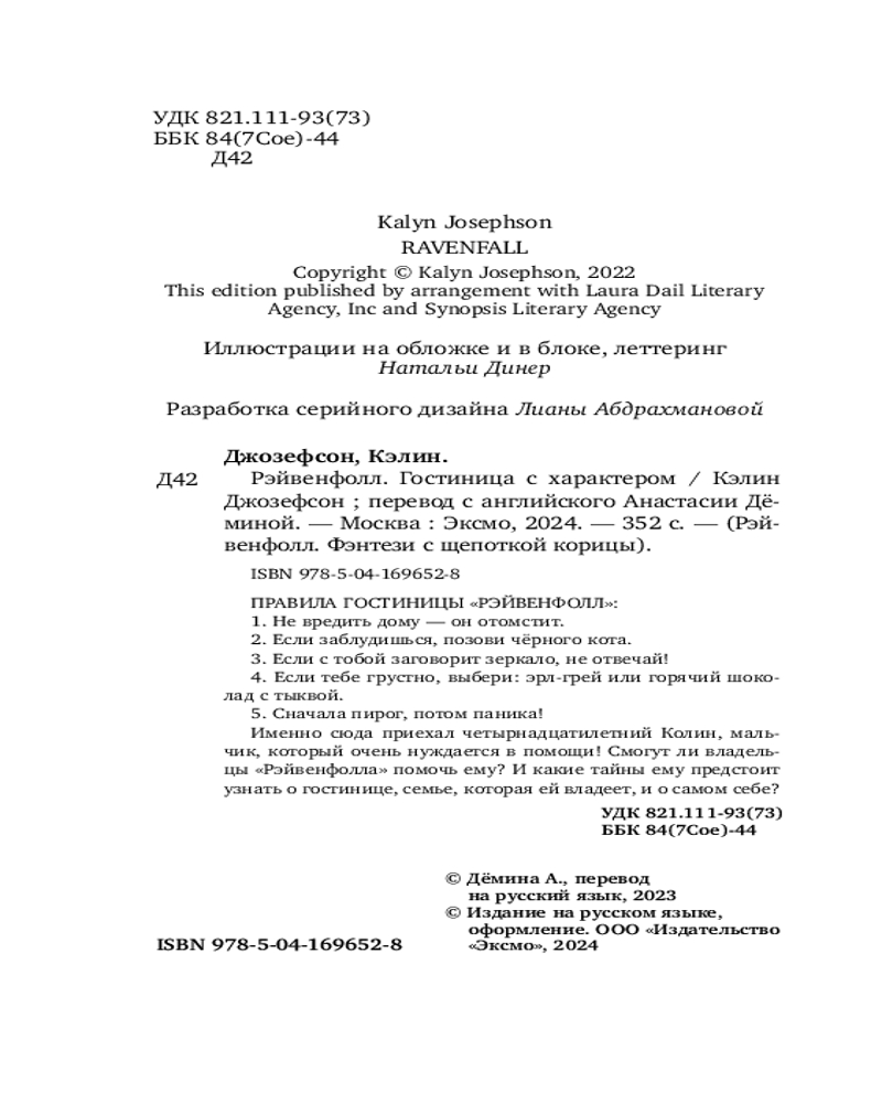 В данный момент этот товар отсутствует в продаже. Возможно, у нас найдется аналогичный или похожий товар здесь. Серия: Детск. Рэйвенфолл. Фэнтези с щепоткой корицы Атмосфера Хэллоуина, мистическая гостиница и главная героиня, которая обожает вязаные вещи, предпочитает чай эрл грей и видит смерть. Захватывающее фэнтези-приключение для детей и взрослых, любимое время года которых — осень! Внутри — красивые форзацы и много милых (и одновременно жутких) деталей.