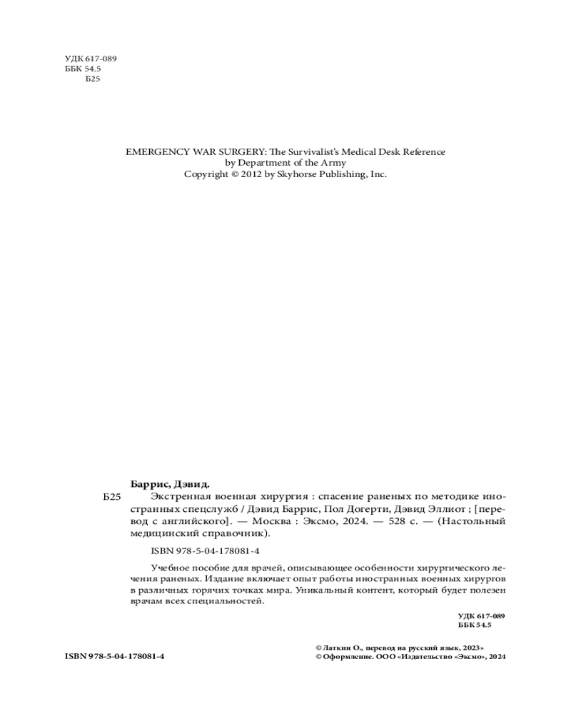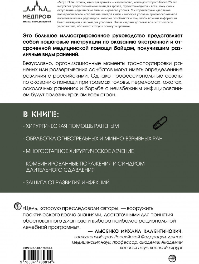 💳 Оплатить за товар можно при получении 🇰🇿 Есть бесплатная доставка по Казахстану от 1 дня 🎁 Копите бонусы с каждой покупки Серия: Настольный медицинский справочник Оказание помощи раненым на поле боя требует от врача знания специальных техник и методик. В первую очередь, речь идет о хирургических манипуляциях в условиях антисанитарии, с которой почти всегда сталкиваются полевые хирурги. |