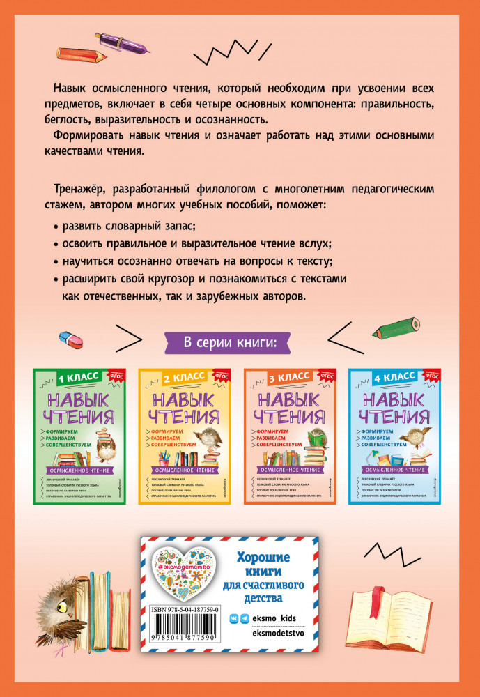 💳 Оплатить за товар можно при получении 🇰🇿 Есть бесплатная доставка по Казахстану от 1 дня 🎁 Копите бонусы с каждой покупки Серия: Навык чтения: формируем, развиваем, совершенствуем. Начальная школа Задача развивающего тренажёра — сделать из ученика 3 класса настоящего читателя, который бегло читает, понимает прочитанное и постоянно совершенствует навык чтения. В пособии собраны наиболее интересные тексты для третьеклассников на стыке литературного чтения, русского языка и окружающего мира. Некоторые из них взяты из бестселлеров детской литературы, другие написаны автором, кандидатом филологических наук А. А. Бондаренко, признанным специалистом в области русской словесности и букваристики. |