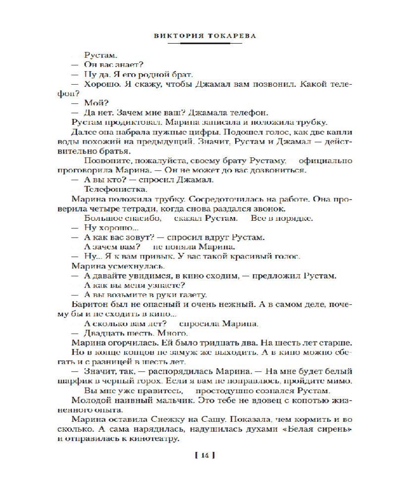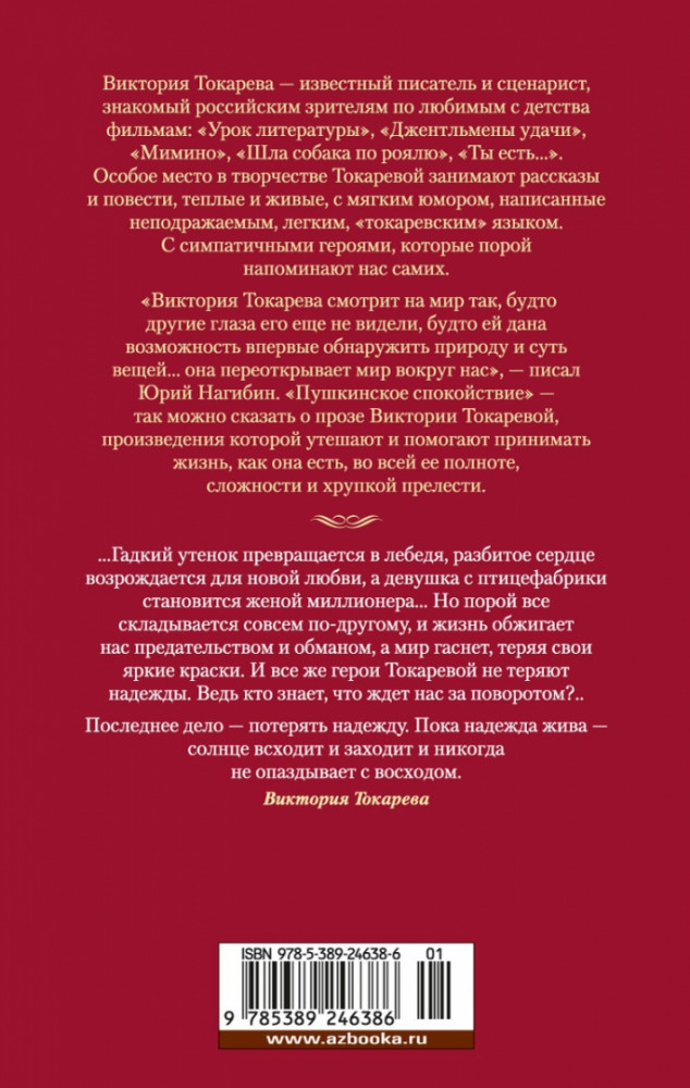 В данный момент этот товар отсутствует в продаже. Возможно, у нас найдется аналогичный или похожий товар здесь. Серия: Русская литература. Большие книги Виктория Токарева — известный писатель и сценарист, знакомый российским зрителям по любимым с детства фильмам: «Урок литературы», «Джентльмены удачи», «Мимино», «Шла собака по роялю», «Ты есть...».
