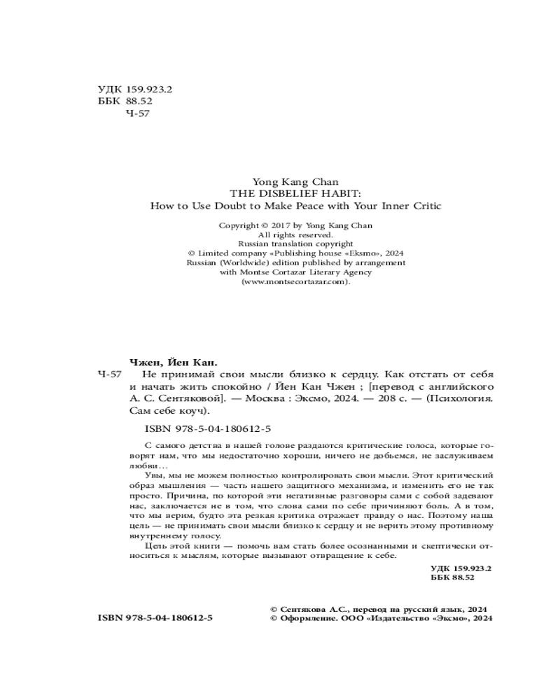 В данный момент этот товар отсутствует в продаже. Возможно, у нас найдется аналогичный или похожий товар здесь. Серия: Психология. Cам себе коуч С раннего возраста у многих из нас в голове звучит этот противный голос, который мы называем внутренним критиком. Есть много различных упражнений и техник, чтобы избавиться от этого, но ничего не работает. Эти навязчивые мысли продолжают появляться всякий раз, когда им заблагорассудится. Вместо того чтобы преодолеть самоосуждение, мы в конечном итоге превращаем внутреннего критика в нашего врага и виним себя за такие мысли, вызывающие отвращение к себе. Вместо того чтобы фиксировать свои мысли и сопротивляться им, мы можем изменить наши бессознательные реакции на эти суждения. Привычка не верить (самому себе) подсказывает вам, как практиковать осознанность и примириться со своим разумом. Просто попробуйте — это изменит вашу жизнь.