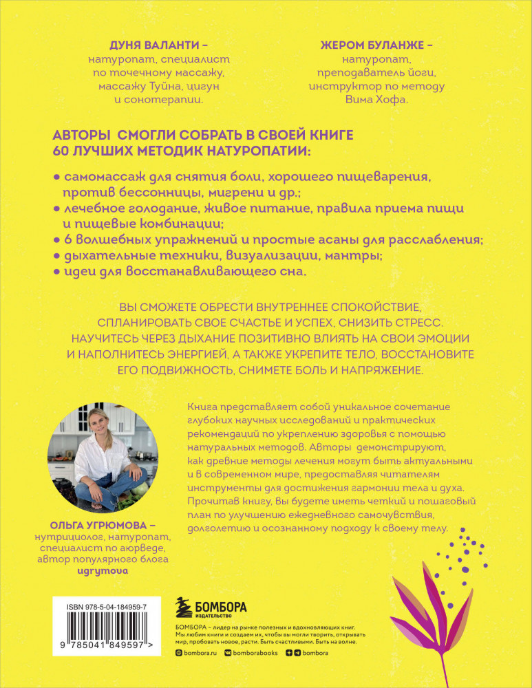💳 Оплатить за товар можно при получении 🇰🇿 Есть бесплатная доставка по Казахстану от 1 дня 🎁 Копите бонусы с каждой покупки Серия: Восточная медицина. Практики для физического и психического здоровья Дуня Валанти — натуропат, специалист по точечному массажу, массажу Туйна, цигун и сонотерапии. Жером Буланже — натуропат, преподаватель йоги, инструктор по методу Вима Хофа. |