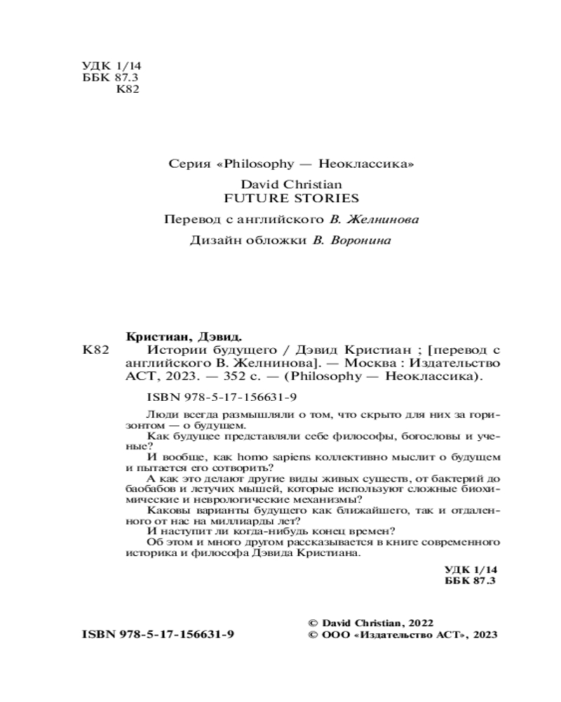 💳 Оплатить за товар можно при получении 🇰🇿 Есть бесплатная доставка по Казахстану от 1 дня 🎁 Копите бонусы с каждой покупки Серия: Philosophy — неоклассика Люди всегда размышляли о том, что скрыто для них за горизонтом — о будущем. Как будущее представляли себе философы, богословы и ученые? И вообще, как homo sapiens коллективно мыслит о будущем и пытается его сотворить? А как это делают другие виды живых существ, от бактерий до баобабов и летучих мышей, которые используют сложные биохимические и неврологические механизмы? Каковы варианты будущего как ближайшего, так и отдаленного от нас на миллиарды лет? И наступит ли когда-нибудь конец времен? Об этом и много другом рассказывается в книге современного историка и философа Дэвида Кристиана. |
