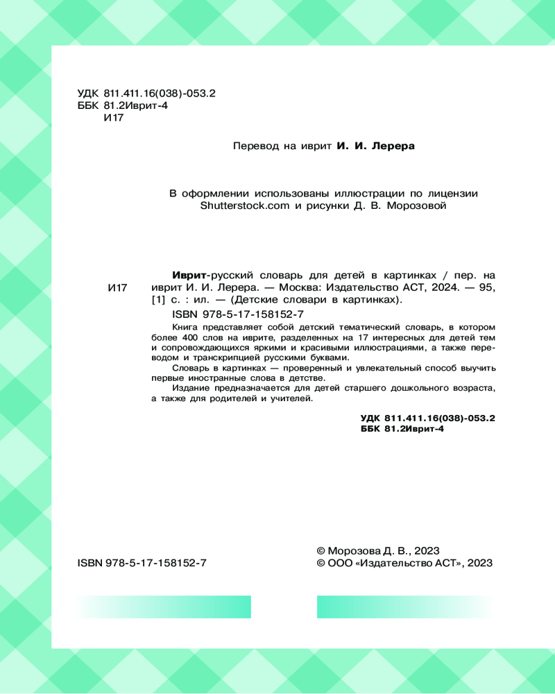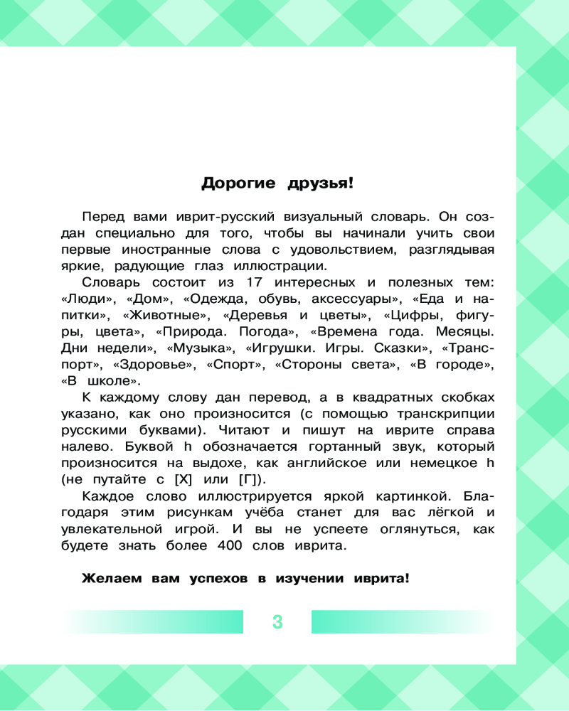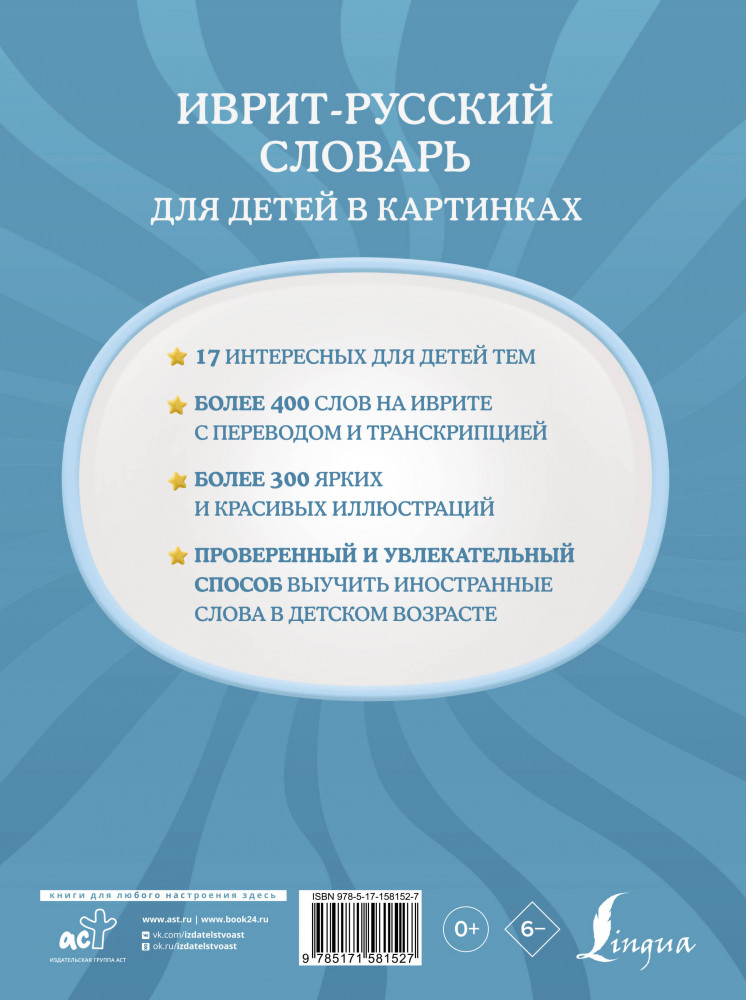 💳 Оплатить за товар можно при получении 🇰🇿 Есть бесплатная доставка по Казахстану от 1 дня 🎁 Копите бонусы с каждой покупки Серия: Детские словари в картинках Книга представляет собой детский тематический словарь, в котором более 400 слов на иврите, разделенных на 17 интересных для детей тем и сопровождающихся яркими и красивыми иллюстрациями, а также переводом и транскрипцией русскими буквами. Словарь в картинках — проверенный и увлекательный способ выучить первые иностранные слова в детстве. Издание предназначается для детей старшего дошкольного возраста, а также для родителей и учителей. |