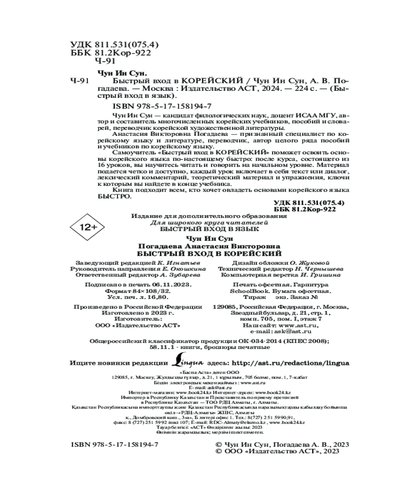 💳 Оплатить за товар можно при получении 🇰🇿 Есть бесплатная доставка по Казахстану от 1 дня 🎁 Копите бонусы с каждой покупки Серия: Быстрый вход в язык Чун Ин Сун — кандидат филологических наук, доцент ИСАА МГУ, автор и составитель многочисленных корейских учебников, пособий и словарей, переводчик корейской художественной литературы. |