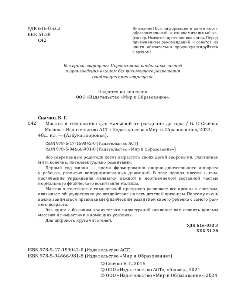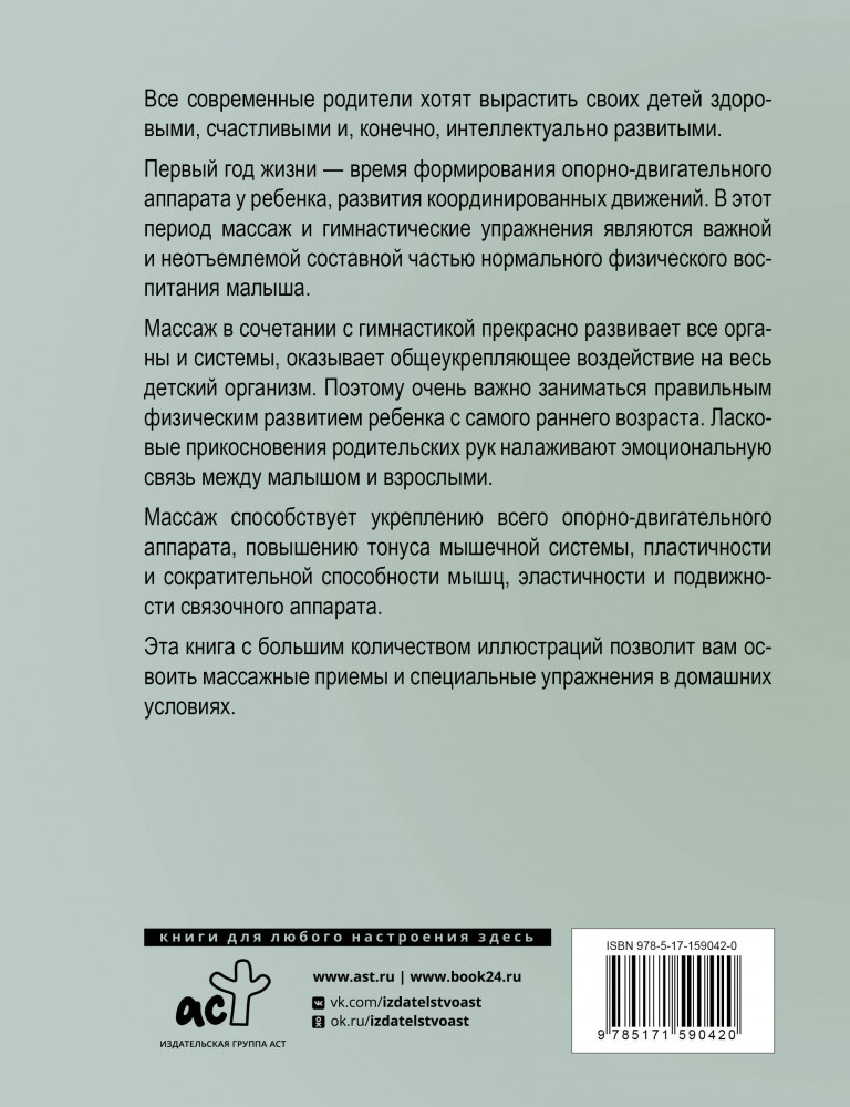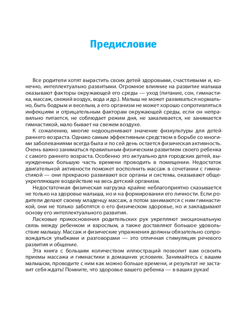 Массаж и гимнастика для малышей от рождения до годаВ данный момент этот товар отсутствует в продаже. Возможно, у нас найдется аналогичный или похожий товар здесь. Серия: Азбука здоровья Все современные родители хотят вырастить своих детей здоровыми, счастливыми и, конечно, интеллектуально развитыми. Первый год жизни — время формирования опорно-двигательного аппарата у ребенка, развития координированных движений. В этот период массаж и гимнастические упражнения являются важной и неотъемлемой составной частью нормального физического воспитания малыша. Массаж в сочетании с гимнастикой прекрасно развивает все органы и системы, оказывает общеукрепляющее воздействие на весь детский организм. Поэтому очень важно заниматься правильным физическим развитием своего ребенка с самого раннего возраста. Эта книга с большим количеством иллюстраций позволит вам освоить приемы массажа и гимнастики в домашних условиях. |
