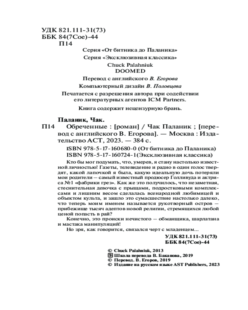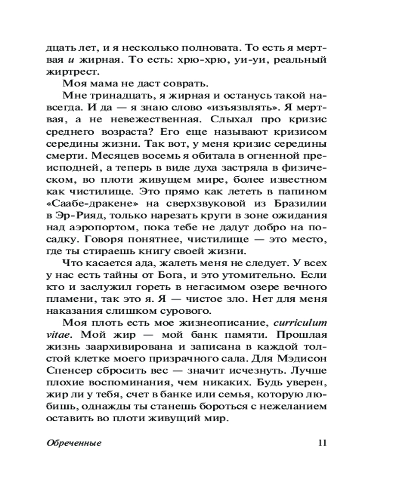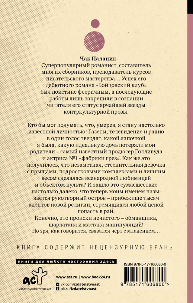 ОбреченныеВ данный момент этот товар отсутствует в продаже. Возможно, у нас найдется аналогичный или похожий товар здесь. Серия: От битника до Паланика (м) Кто бы мог подумать, что, умерев, я стану настолько известной личностью! Газеты, телевидение и радио в один голос твердят, какой лапочкой я была, какую идеальную дочь потеряли мои родители — самый известный продюсер Голливуда и актриса № 1 «фабрики грез». Как же это получилось, что незаметная, стеснительная девочка с прыщами, подростковыми комплексами и лишним весом сделалась всенародной любимицей и объектом культа, и зашло это сумасшествие настолько далеко, что теперь моим именем называется рукотворный остров — прибежище тысяч адептов новой религии, стремящихся любой ценой попасть в рай? Конечно, это происки нечистого — обманщика, шарлатана и мастака манипуляций! Но зря, как говорится, связался черт с младенцем... |