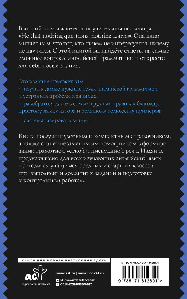 Книга послужит удобным и компактным справочником, а также станет незаменимым помощником в формировании грамотной устной и письменной речи. Издание предназначено для всех изучающих английский язык, пригодится учащимся средних и старших классов при выполнении домашних заданий и подготовке к контрольным работам.