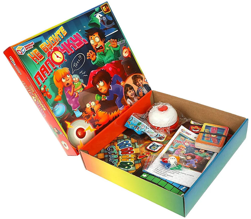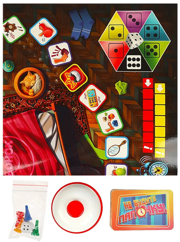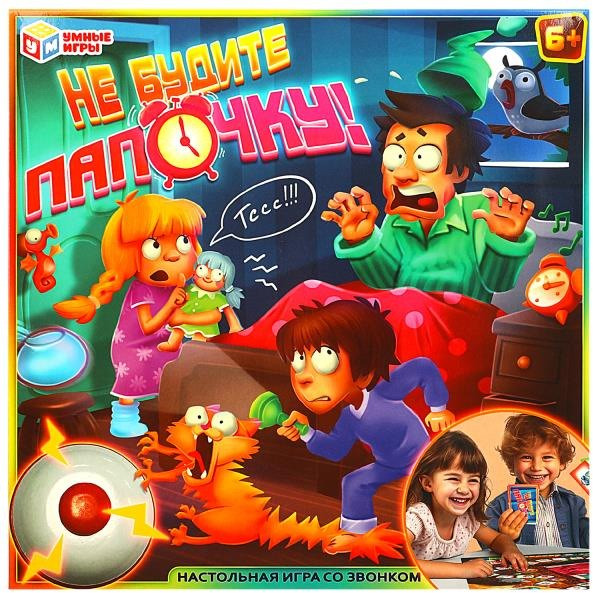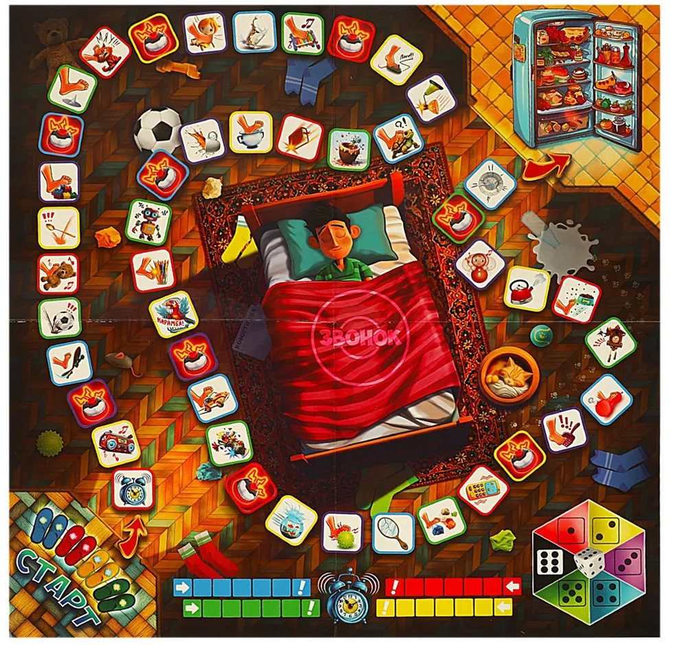 В данный момент этот товар отсутствует в продаже. Возможно, у нас найдется аналогичный или похожий товар здесь. Цель игры «Не будите папочку!» первым добраться до холодильника, в котором спрятан вкусный торт, не разбудив спящего папочку. Разложите игровое поле в центре стола. Выберите фишки с героями, за которых вы будете играть. За одного героя может играть только один участник. Поставьте фишки с героями на старт (каждый игрок ставит героя на тапочки). Пластиковые фишки необходимо — поставить на старты-стрелки внизу поля. Тщательно перемешайте и разделите все карты с картинками поровну между игроками. Игроки выкладывают карты перед собой картинками вверх. Разместите звонок в центре поля на специально отведённом месте.