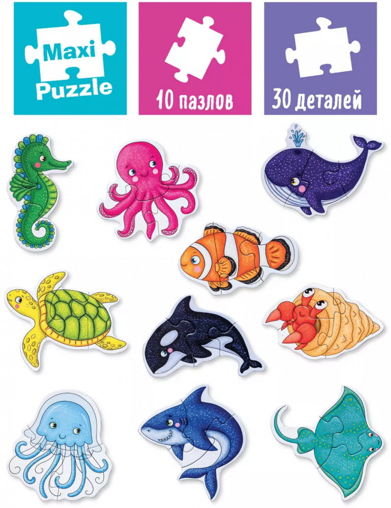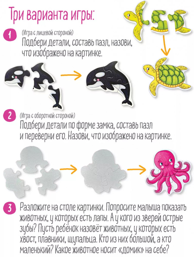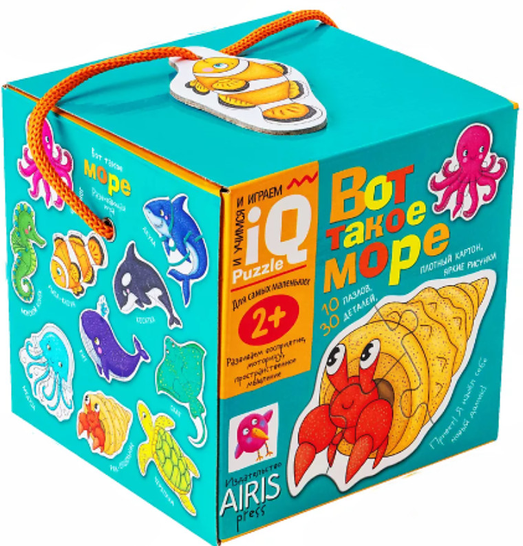 💳 Оплатить за товар можно при получении 🇰🇿 Есть бесплатная доставка по Казахстану от 1 дня 🎁 Копите бонусы с каждой покупки Серия: IQ игры для самых маленьких Пазлы «Вот такое море» — это увлекательная настольная игра для знакомства ребёнка с морскими животными, развития восприятия и мелкой моторики. В наборе 10 пазлов с цветными картинками животных, которые складываются из 30 элементов. Цель игры — правильно сложить из трёх частей каждую картинку-пазл. Внутри есть подробное описание правил игры. |