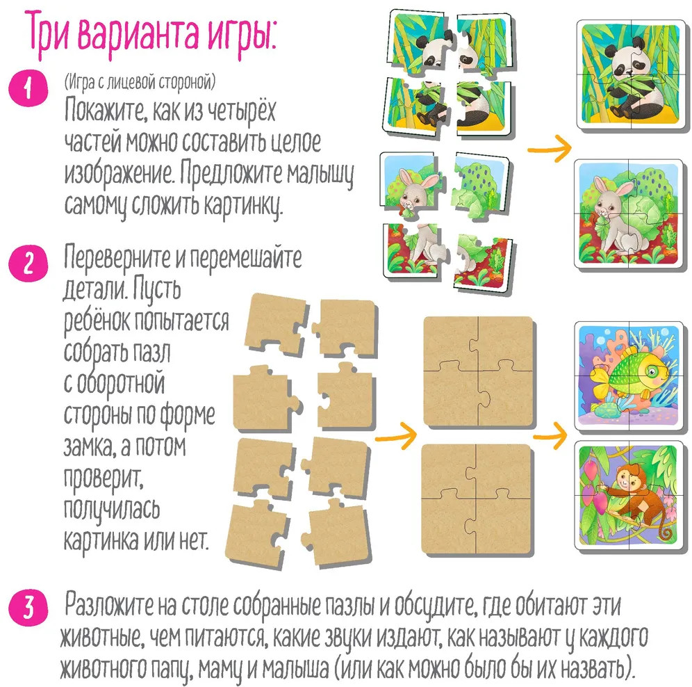 💳 Оплатить за товар можно при получении 🇰🇿 Есть бесплатная доставка по Казахстану от 1 дня 🎁 Копите бонусы с каждой покупки Серия: IQ Пазлы деревянные Деревянные пазлы выполнены из экологически чистых материалов. Они прочные и долговечные, поэтому могут передаваться от ребёнка к ребёнку. Размер крупных деталей идеально рассчитан под эргономику детской руки. В наборе собрано 8 красочных изображений забавных животных. Каждая картинка складывается из четырёх частей. Всего в коробочке 32 детали. Занятие с пазлами будет способствовать развитию мелкой моторики, восприятия, внимания и пространственного мышления. «Шпаргалка» для родителей, которая также входит в набор, содержит задания для запуска и активизации речи ребёнка. |
