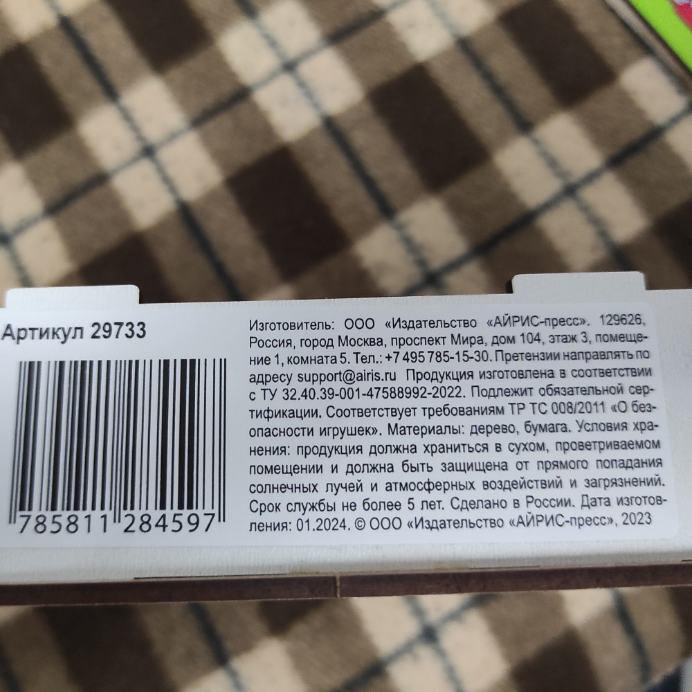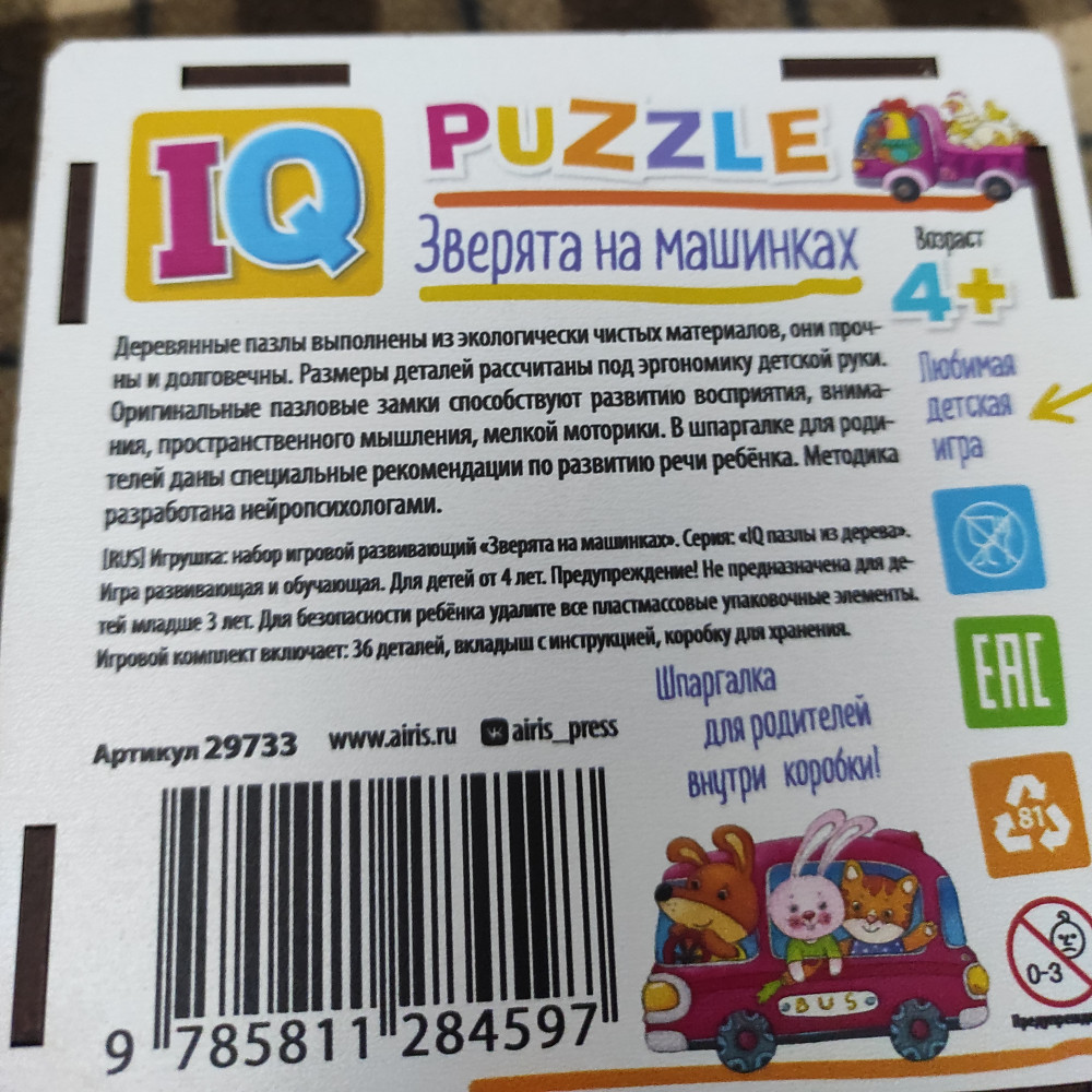Брала ребенку для развития, т.к. понравилось, что пазлы деревянные и красочные. Но все портит запах клея от самих пазлов. Поэтому держим на балконе для выветривания. После игры обязательно надо мыть руки.