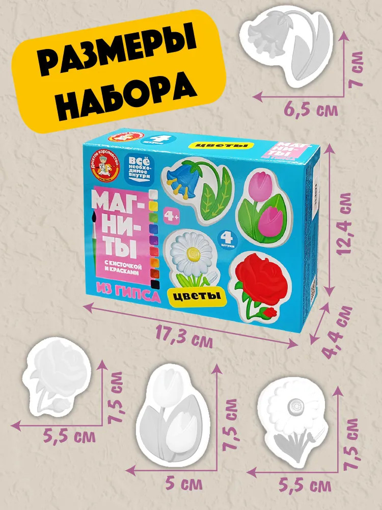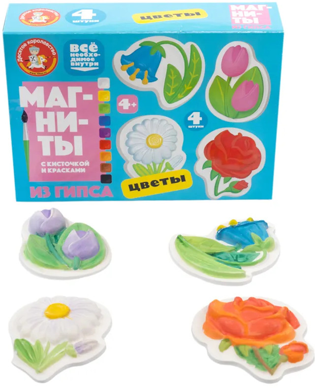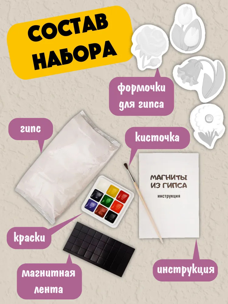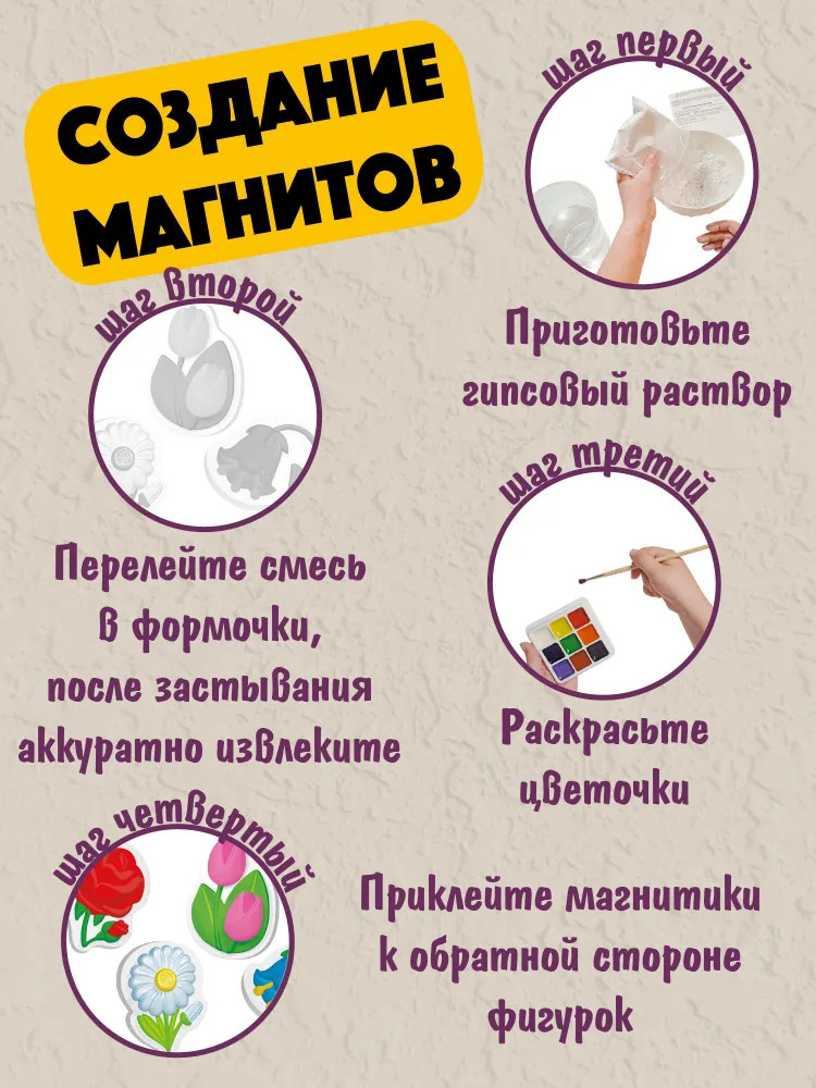 С помощью набора для создания магнитов из гипса под роспись «Цветы» можно своими руками изготовить магниты с весенними мотивами. Следуя пошаговой инструкции, создайте оригинальные подарки для близких.