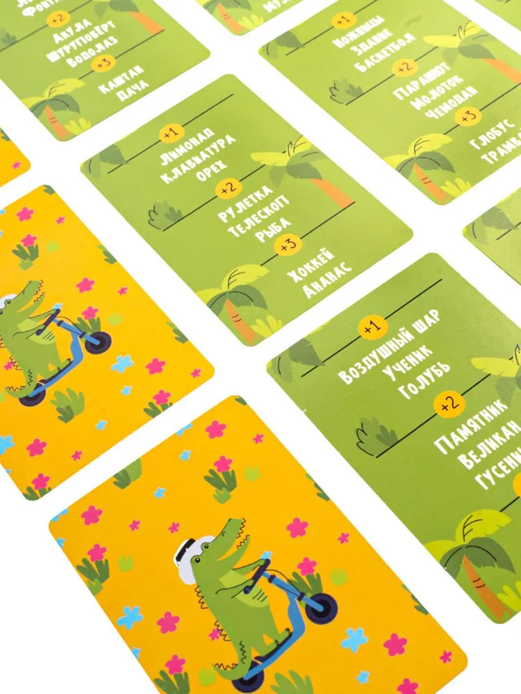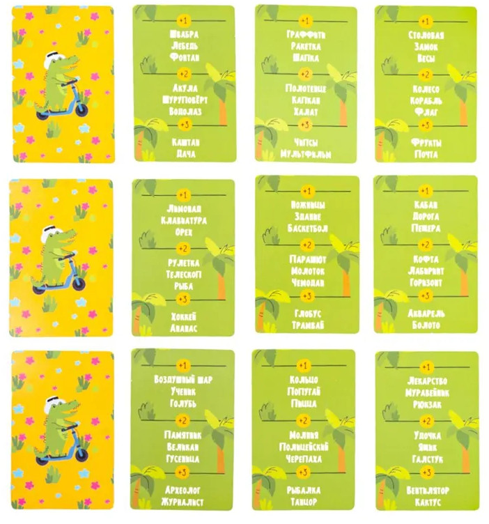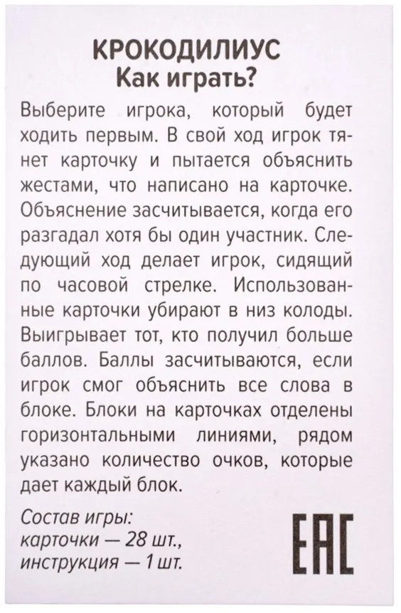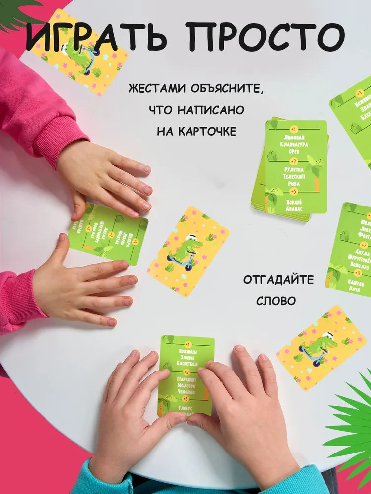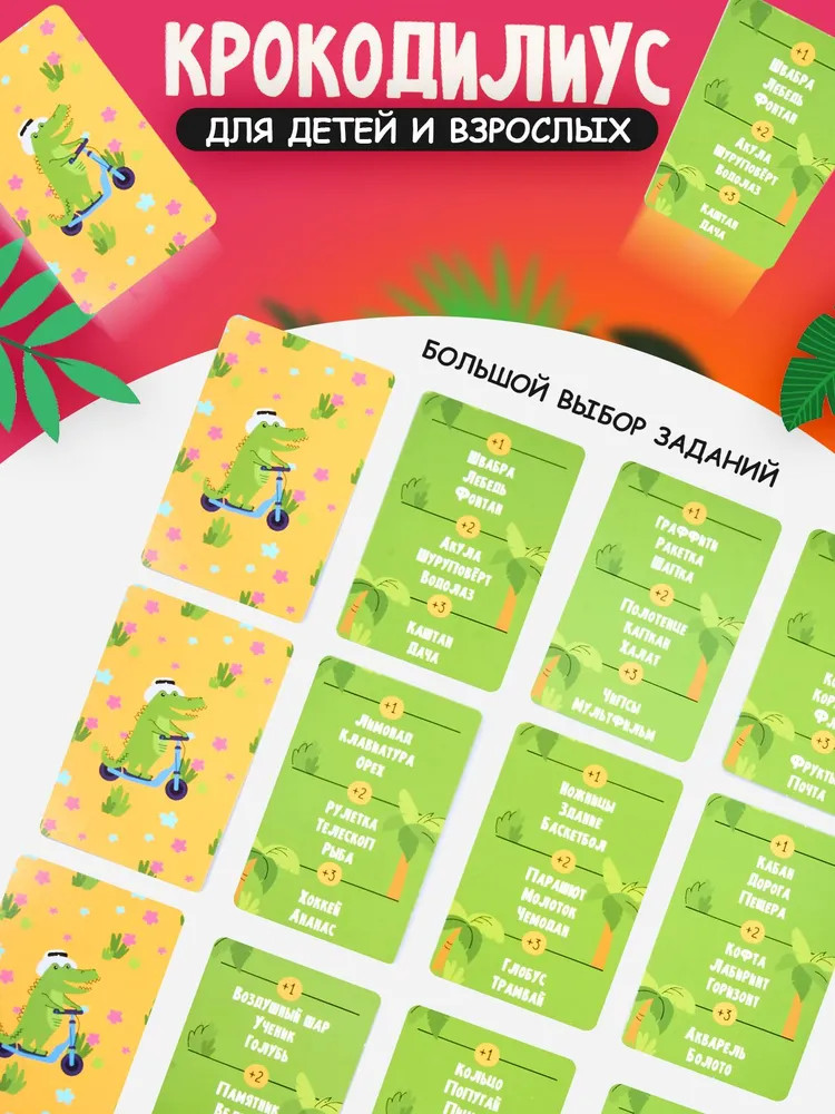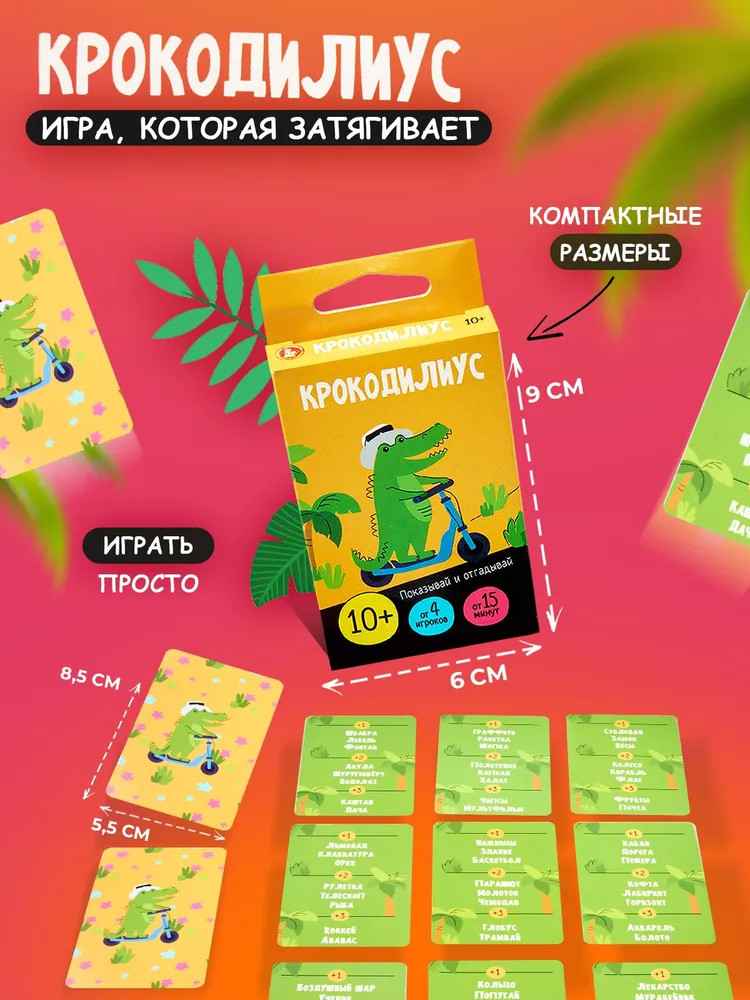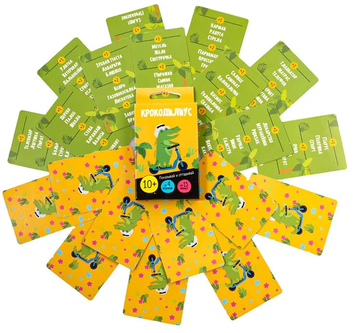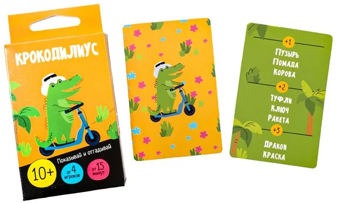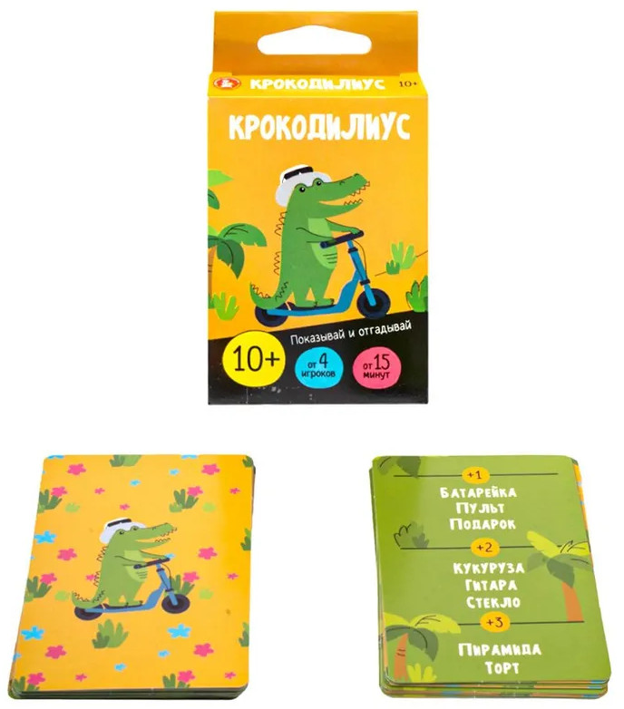 💳 Оплатить за товар можно при получении 🇰🇿 Есть бесплатная доставка по Казахстану от 1 дня 🎁 Копите бонусы с каждой покупки Настольная игра для детей «Крокодилиус» — это увлекательная игра для детей и взрослых, в которой нужно показывать и отгадывать слова. Игра рассчитана на 4 и более игроков. В наборе имеются 28 карточек и инструкция. |
