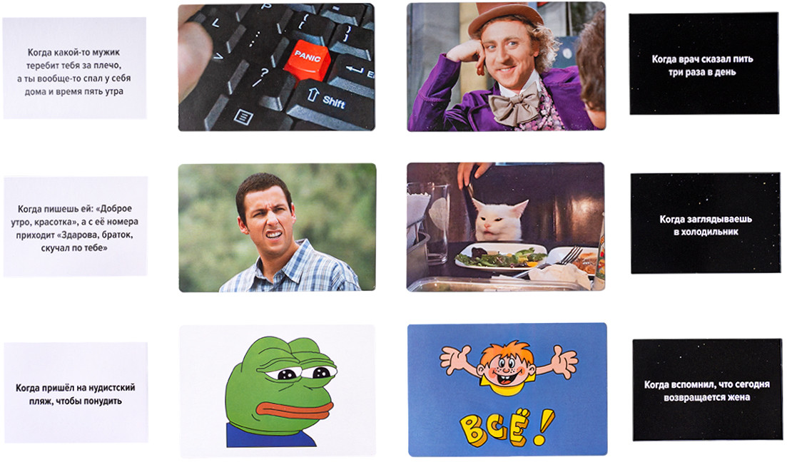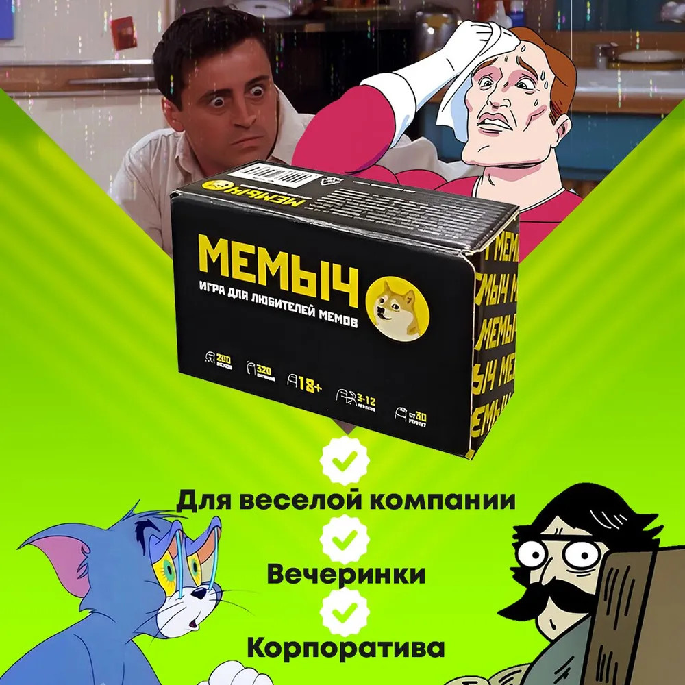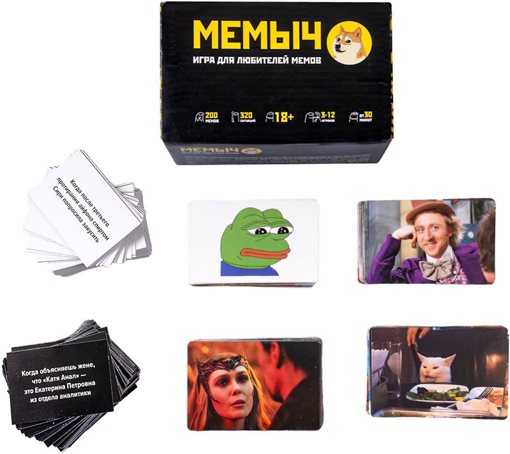 💳 Оплатить за товар можно при получении 🇰🇿 Есть бесплатная доставка по Казахстану от 1 дня 🎁 Копите бонусы с каждой покупки Весёлая игра для любителей мемов «МЕМЫЧ» предназначена для лиц 18+ и рассчитана на 3-12 игроков. Развивает актерские и коммуникативные способности, сплачивает коллектив и поднимает настроение. |