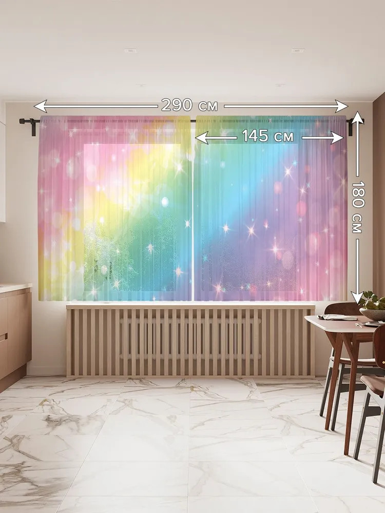 Изделие изготовлено из сетчатого полотна (фатин), содержащего волокна 100% полиэстера, хорошо держит форму, легко гладится, не дает усадки и не растягивается при длительной эксплуатации. Занавеска длинная на шторной ленте 6 см. уже готова к использованию, ее можно повесить на крючки (в комплекте 50 крючков), карниз для штор, гардину или трубу. Тюль-сеточка с фотопринтом отлично подходит для кухни и комнаты. Края имеют ровный срез, не осыпаются в процессе эксплуатации и не требуют дополнительной обработки. Вуаль подходит для дачи, спальни, балкона, кабинета и детской комнаты, отлично рассеивает и пропускает небольшое количество дневного света около 80%.