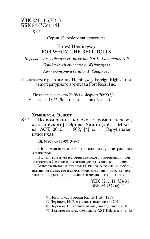 По ком звонит колоколВ данный момент этот товар отсутствует в продаже. Возможно, у нас найдется аналогичный или похожий товар здесь. Серия: Зарубежная классика «По ком звонит колокол» — один из лучших романов Хемингуэя. |