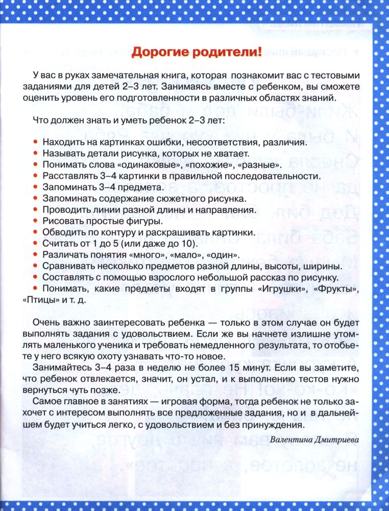 Тесты с наклейками. Что должен знать ваш ребенок. 2-3 годаВалентина Геннадьевна Дмитриева В данный момент этот товар отсутствует в продаже. Возможно, у нас найдется аналогичный или похожий товар здесь. Серия: Очень хорошая книга Эта замечательная книга познакомит вас с тестовыми заданиями для детей 2–3 лет. Занимаясь вместе с ребенком, вы сможете оценить уровень его подготовленности в различных областях знаний. |