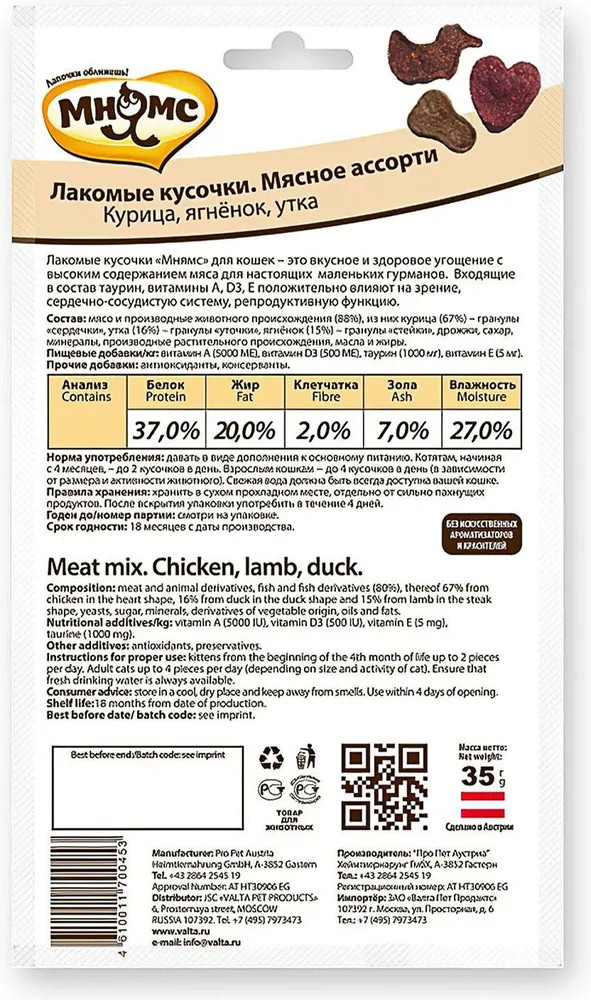 Мнямс Лакомство для кошек «Мясное ассорти»В данный момент этот товар отсутствует в продаже. Возможно, у нас найдется аналогичный или похожий товар здесь. Условия хранения товара: температурный режим от -10 до +25°С. |