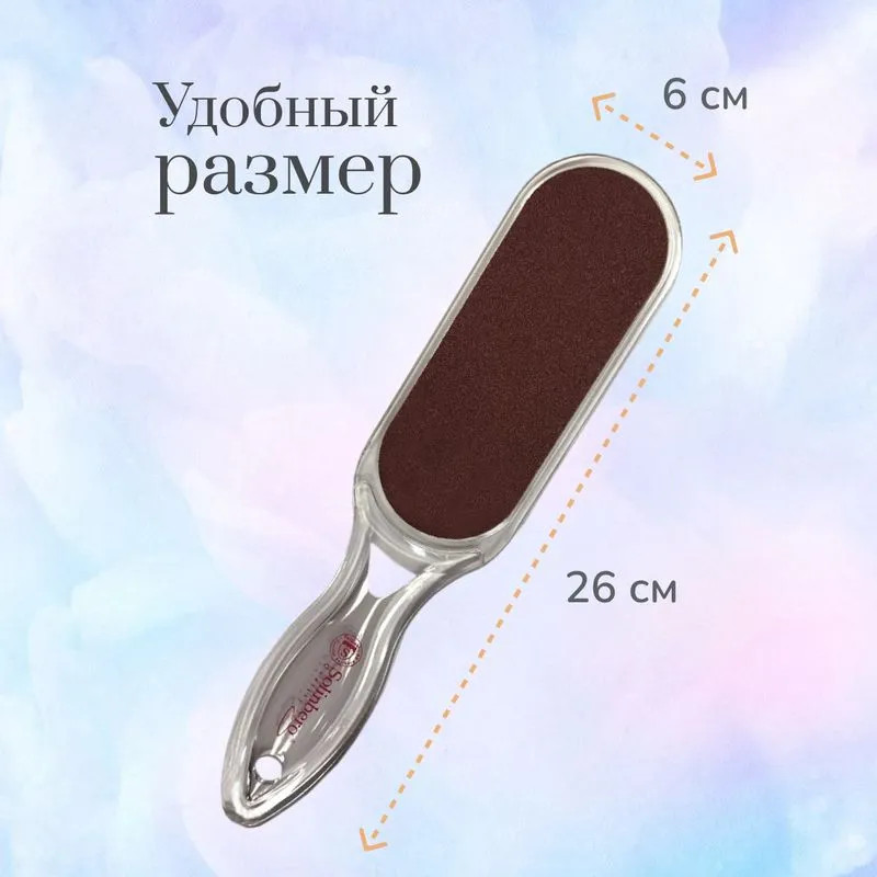 Педикюрная терка имеет два вида рабочей поверхности с разной степенью абразивности: 100 и 180 грит, а также удобную пластиковую ручку. Абразив 100 грит применяется для первичной чистки, шлифовки и удаления огрубевшей и ороговевшей кожи стоп, пяток, мозолей, трещин и натоптышей. Вторая, более мягкая сторона 180 грит, позволит деликатно придать гладкий и ухоженный вид в завершающей полировке и обработке стоп.