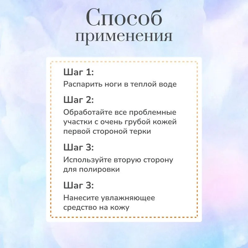 Способ применения: с помощью терки для ног аккуратными движениями начинайте соскабливать утолщенные участки кожи. После использования нанесите на кожу ног питательный крем для более длительного сохранения эффекта. |