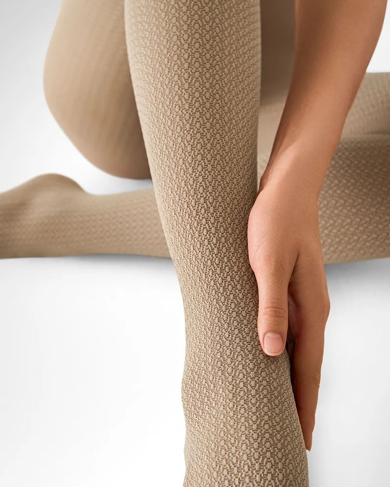 Она почти как капроновые колготки. Между рисунками мелкие сеточки. 4 размер на ОБ 100 отлично подошел. Не жмет не давит