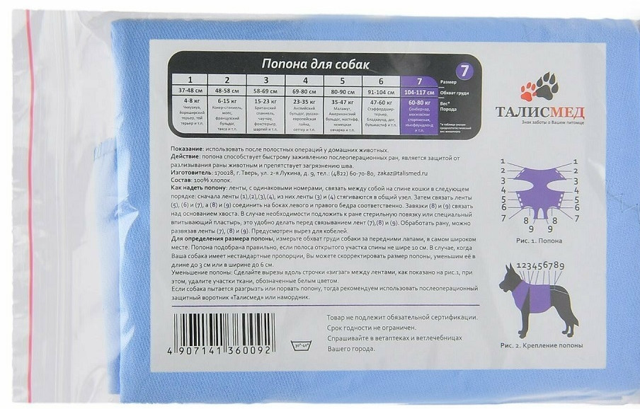 Послеоперационная попона для животных способствует быстрому заживлению послеоперационных ран, является защитой от разлизывания раны животным и препятствует загрязнению шва. Крепится на шее, на спине и за хвостом с помощью длинноворсных липких лент (время надевания около 40 сек.), которые обеспечивают надежное крепление даже в случае попадания на них шерсти животного.
