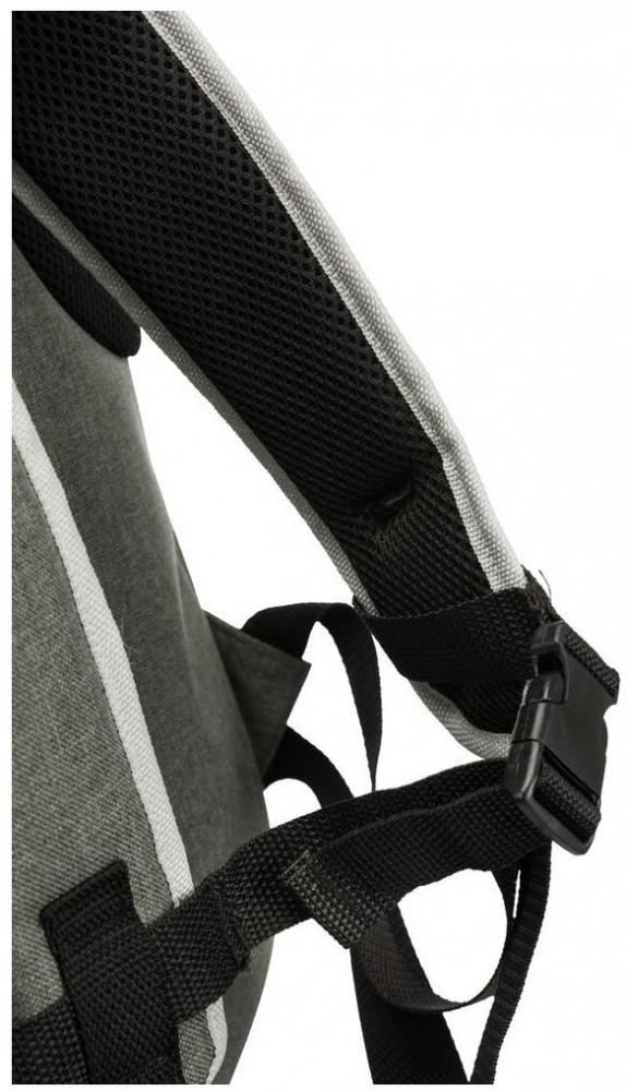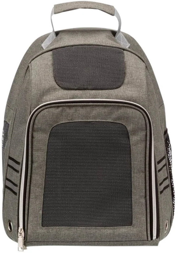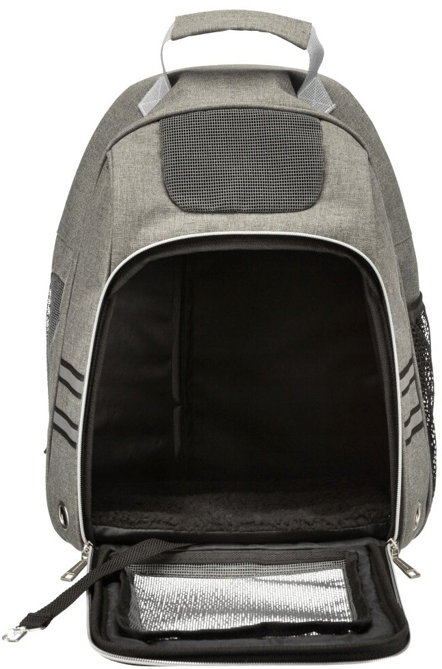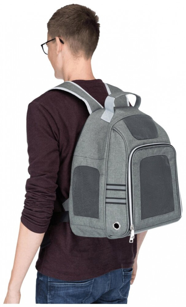 Рюкзак оснащен небольшой ручкой сверху, полностью регулируемыми наплечными нейлоновыми лямками с мягкими вставками и поясным ремнем, поэтому его можно использовать для длительных прогулок. Внутри переноски есть короткий поводок с маленьким карабином для пристежки к ошейнику питомца, поэтому он не сможет выбраться из переноски без вашего ведома. Переноска также оснащена светоотражающими вставками. Материал — плотный полиэстер, который легко чистится даже влажной тряпкой.