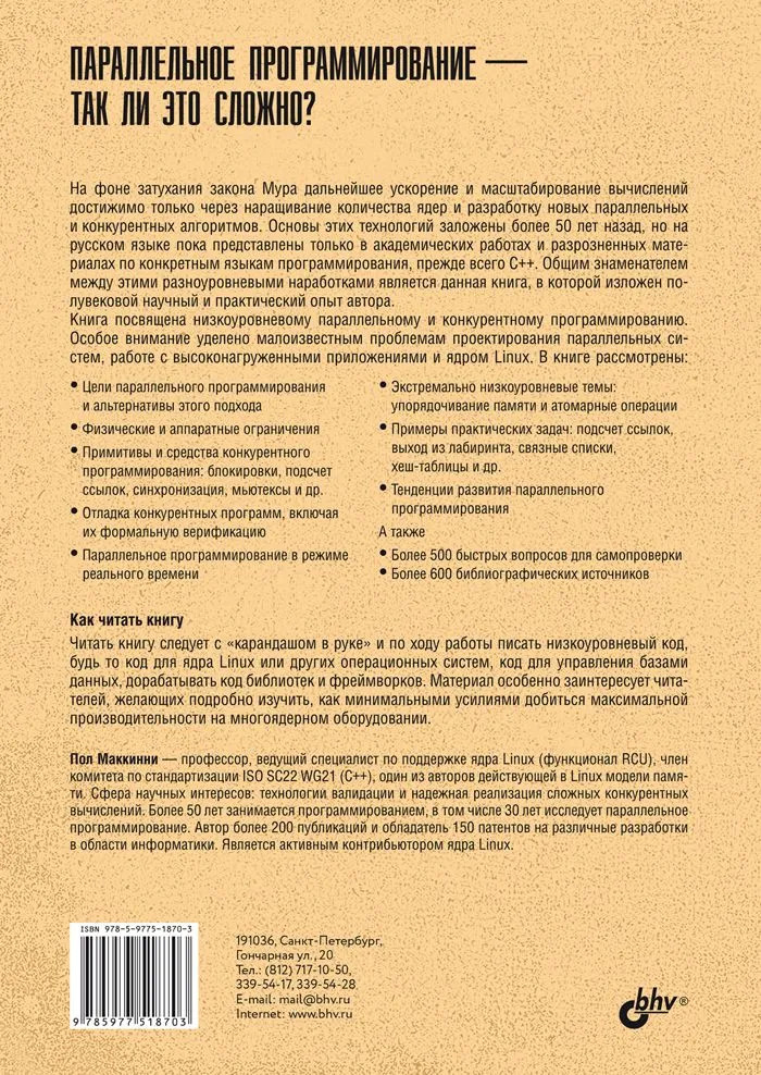 💳 Оплатить за товар можно при получении 🇰🇿 Есть бесплатная доставка по Казахстану от 1 дня 🎁 Копите бонусы с каждой покупки Книга исследует различные низкоуровневые механизмы и алгоритмы, лежащие в основе современных параллельных и конкурентных вычислений, в частности реализованные в ядре Linux. Рассмотрены примитивы синхронизации (мьютексы и блокировки), владение данными, валидация, копирование и запись, эвристические методы разработки параллельных и конкурентных алгоритмов, подбор аппаратного обеспечения и другие малоизвестные находки в области параллелизма. Также уделено внимание упрощению и оптимизации параллельных вычислений. Наконец, спрогнозированы возможные тенденции развития параллельного программирования с учётом современных разработок нового аппаратного обеспечения. |