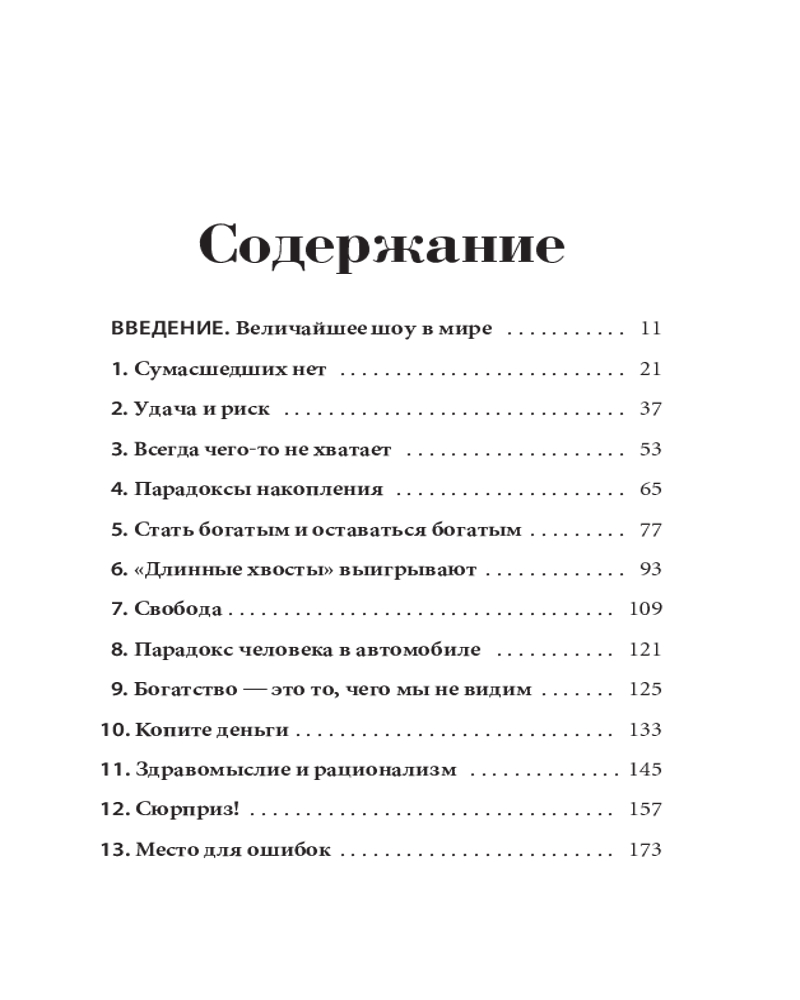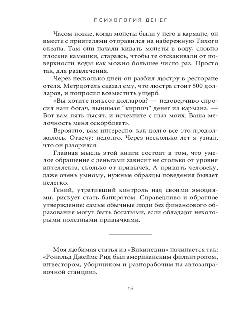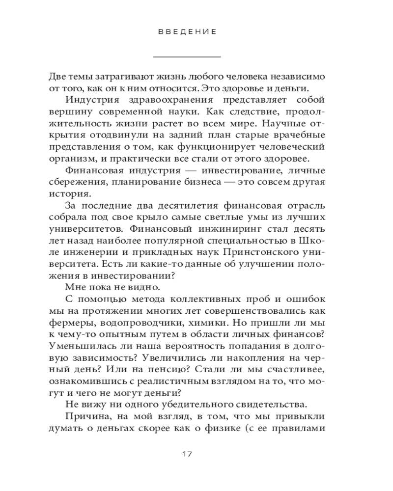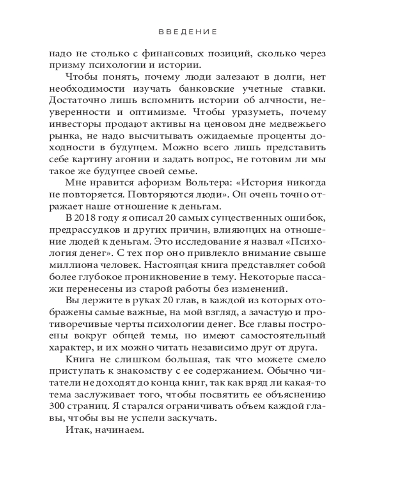 Психология денег. Вечные уроки богатства, жадности и счастьяинтересное содержание легко читается полезные советы качество печати не увлекает В данный момент этот товар отсутствует в продаже. Возможно, у нас найдется аналогичный или похожий товар здесь. Серия: Бизнес Говоря об умелом обращении человека с деньгами, мы имеем в виду не столько его знания, сколько действия. А обучить людей (даже по-настоящему умных) правильному поведению бывает нелегко. Деньги, в частности инвестиции, личные финансы и бизнес-решения, обычно считаются вотчиной математики, где данные и формулы четко подсказывают нам алгоритм действий. Но в реальном мире люди принимают финансовые решения не на основании графиков и таблиц, а в ходе бесед за ланчем или в конференц-зале, где странным образом перемешиваются личная история, ваше собственное уникальное мировоззрение, эго, маркетинг и самые невероятные стимулы. |