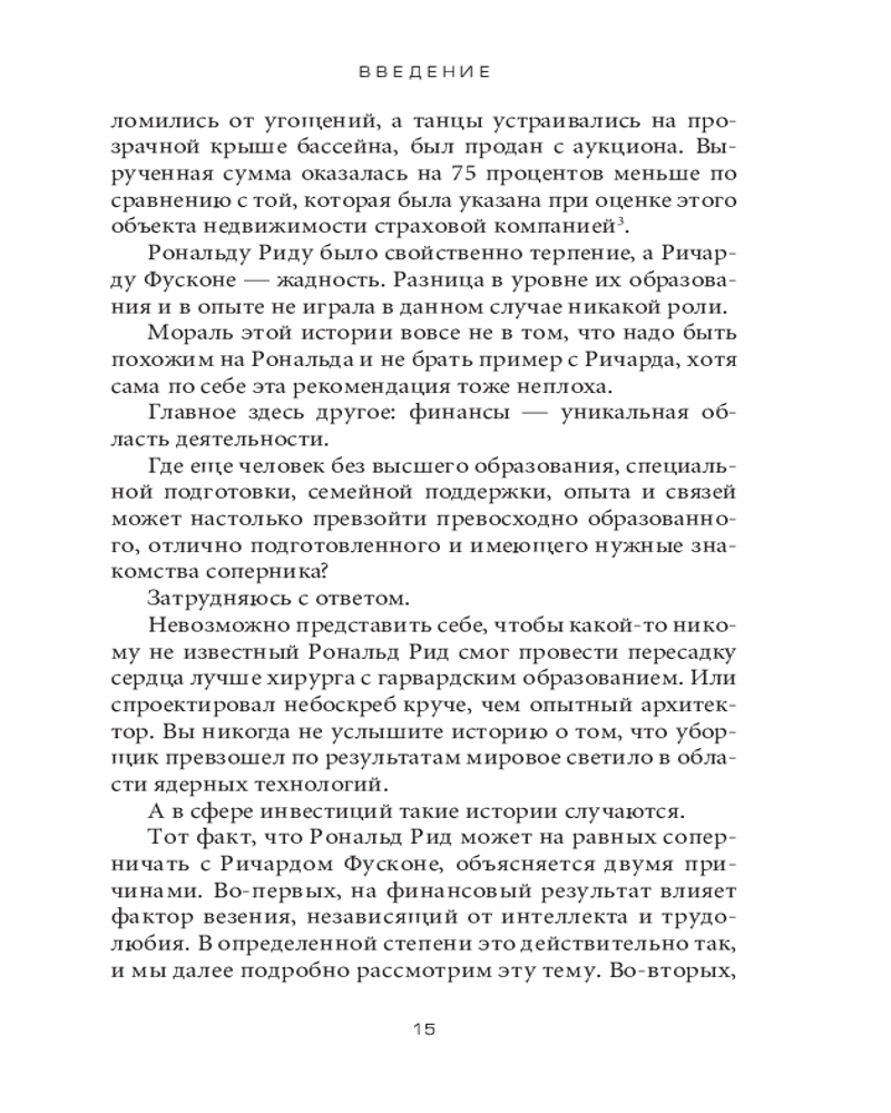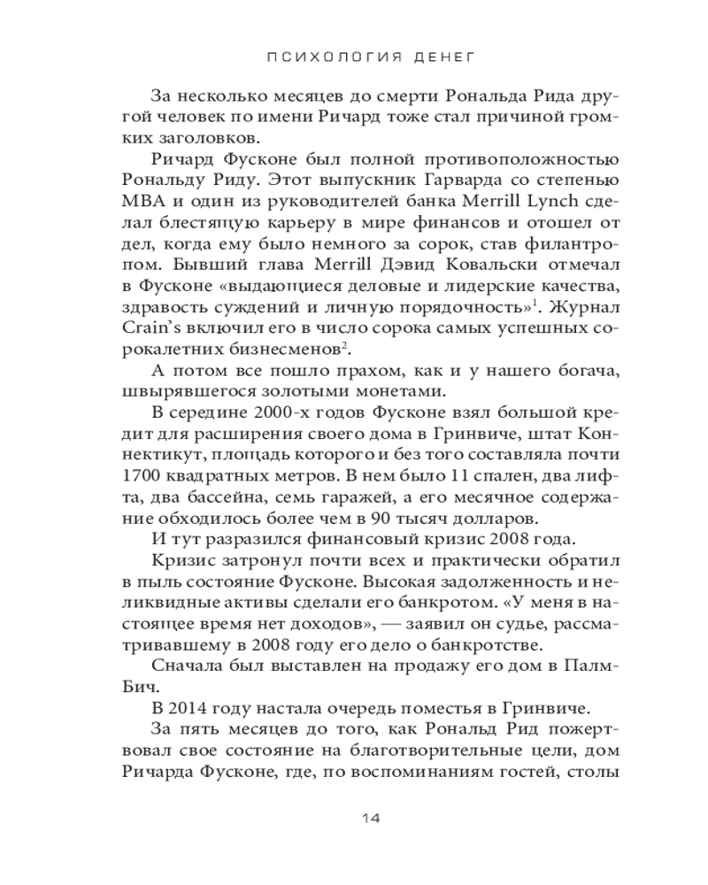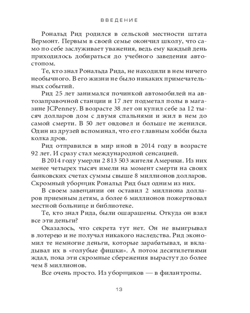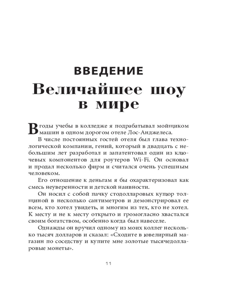 Психология денег. Вечные уроки богатства, жадности и счастьяинтересное содержание легко читается полезные советы качество печати не увлекает В данный момент этот товар отсутствует в продаже. Возможно, у нас найдется аналогичный или похожий товар здесь. Серия: Бизнес Говоря об умелом обращении человека с деньгами, мы имеем в виду не столько его знания, сколько действия. А обучить людей (даже по-настоящему умных) правильному поведению бывает нелегко. Деньги, в частности инвестиции, личные финансы и бизнес-решения, обычно считаются вотчиной математики, где данные и формулы четко подсказывают нам алгоритм действий. Но в реальном мире люди принимают финансовые решения не на основании графиков и таблиц, а в ходе бесед за ланчем или в конференц-зале, где странным образом перемешиваются личная история, ваше собственное уникальное мировоззрение, эго, маркетинг и самые невероятные стимулы. |