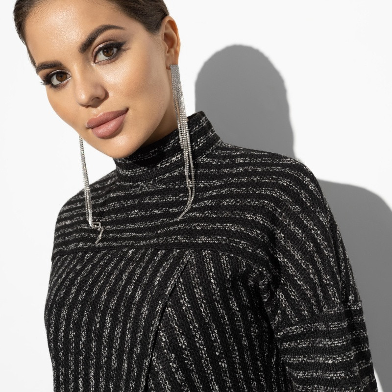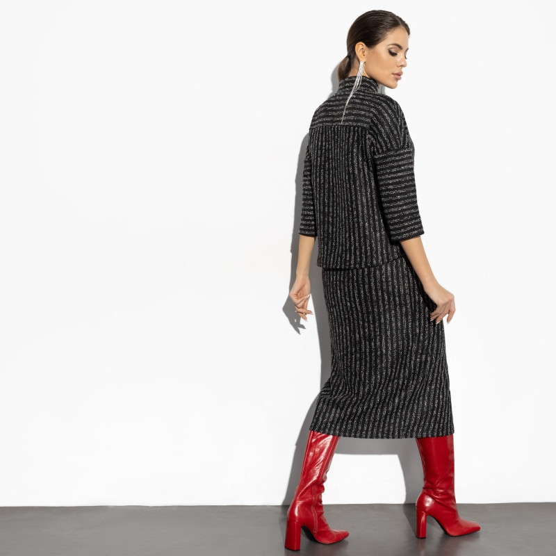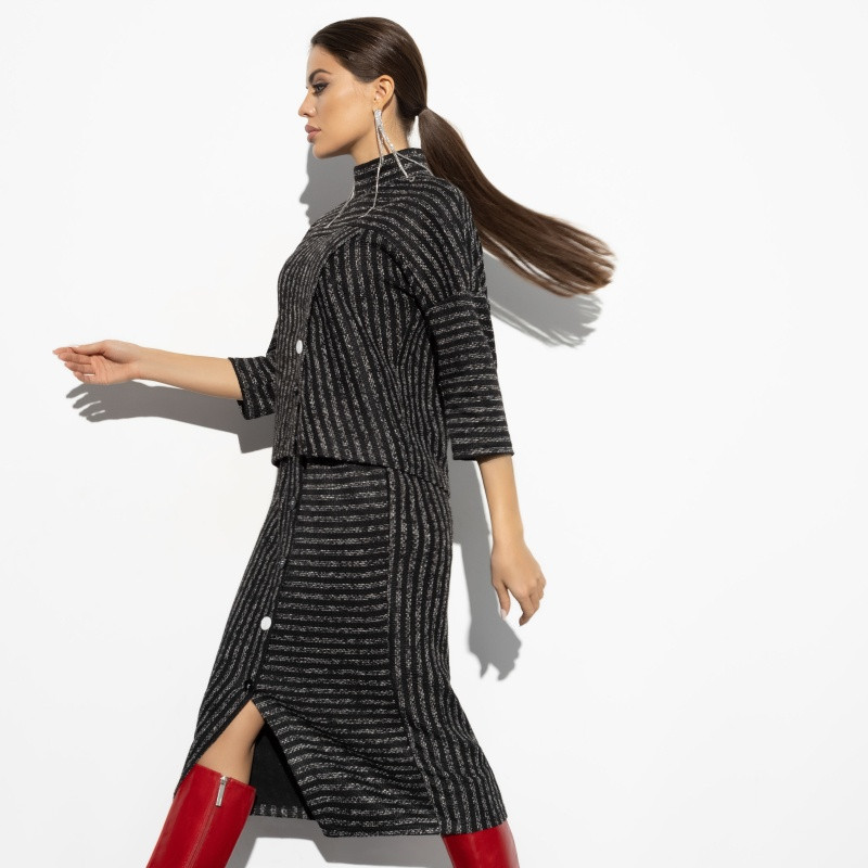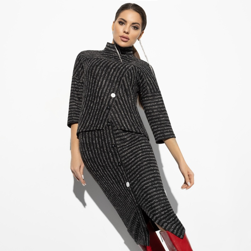 Отличный костюм, интересный фасон!! Теплый, ткань с эластаном. Юбка без молнии, но очень легко надевается. Блуза с высоким воротом, для меня комфортно, сзади на вороте молния. Интересное и стильное сочетание полос. Единственное, заменю пуговицы. Костюм на размер маломерит. На рост 175 см сел превосходно, длина юбки и блузы очень удачная.