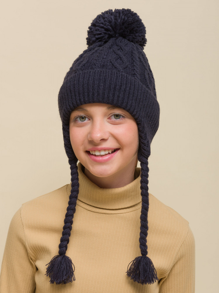 Внутри флисовая подкладка. Она мягкая и обеспечивает дополнительную защиту от холода. Модель хорошо садится по голове ребёнка, плотно прилегает, не сползает. Основная вязка шапки — модные текстурные «косы». Цельновывязаные ушки по бокам прикрывают уши ребёнка от холода и ветра. Декоративные завязки выполнены в виде косичек с кисточками — оригинально и стильно. Помпон выполнен из ниток в тон изделия. Эта модель станет отличным подарком для маленьких модников!