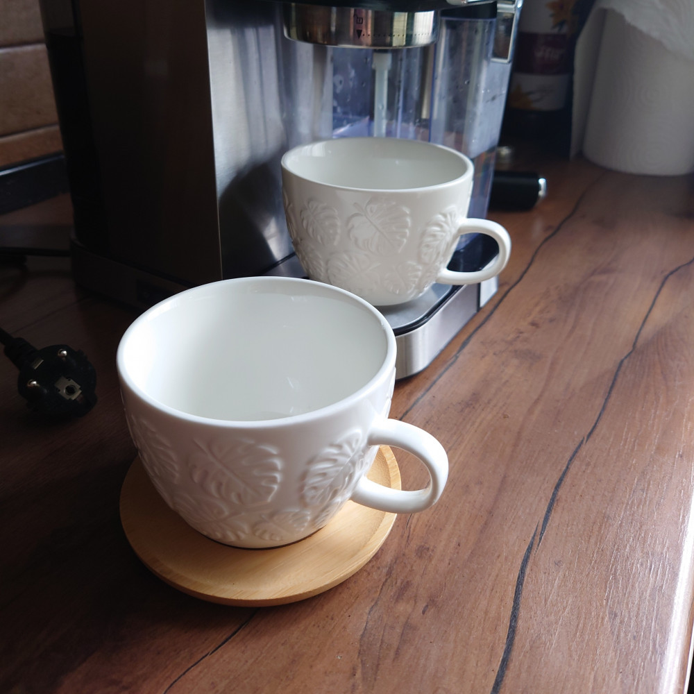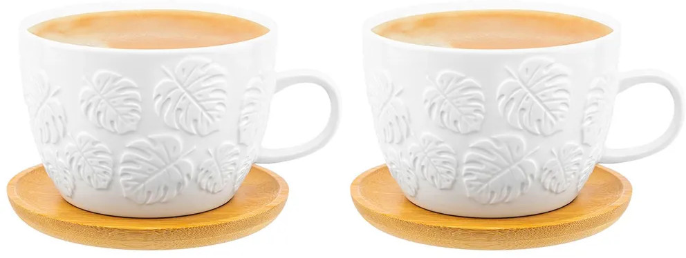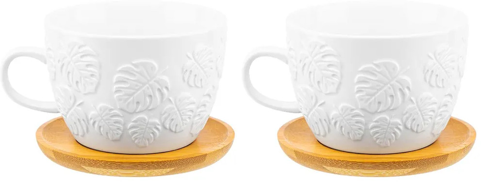 Набор из двух чашек для капучино и латте Elan Gallery «Тропики» выполнен из белого фарфора с рельефным узором в виде листьев. Чашки имеют подставку из бамбука. Чашки подходит ценителям кофе, которые любят пить из красивой и необычной посуды. Это идеальный вариант для того, чтобы согреться горячим напитком зимой и освежиться прохладным лимонадом летом. Можно использовать и для других напитков, например, чая. Интересная чашка с удобной ручкой украсит ваш стол своим стильным дизайном как на праздник, так и в будни. Без бамбуковой подставки можно использовать в микроволновой печи и мыть в посудомоечной машине. Поставляется в стильной картонной упаковке. Красивая чашка станет отличным подарком для ваших близких или станет настоящим украшением вашей кухни.