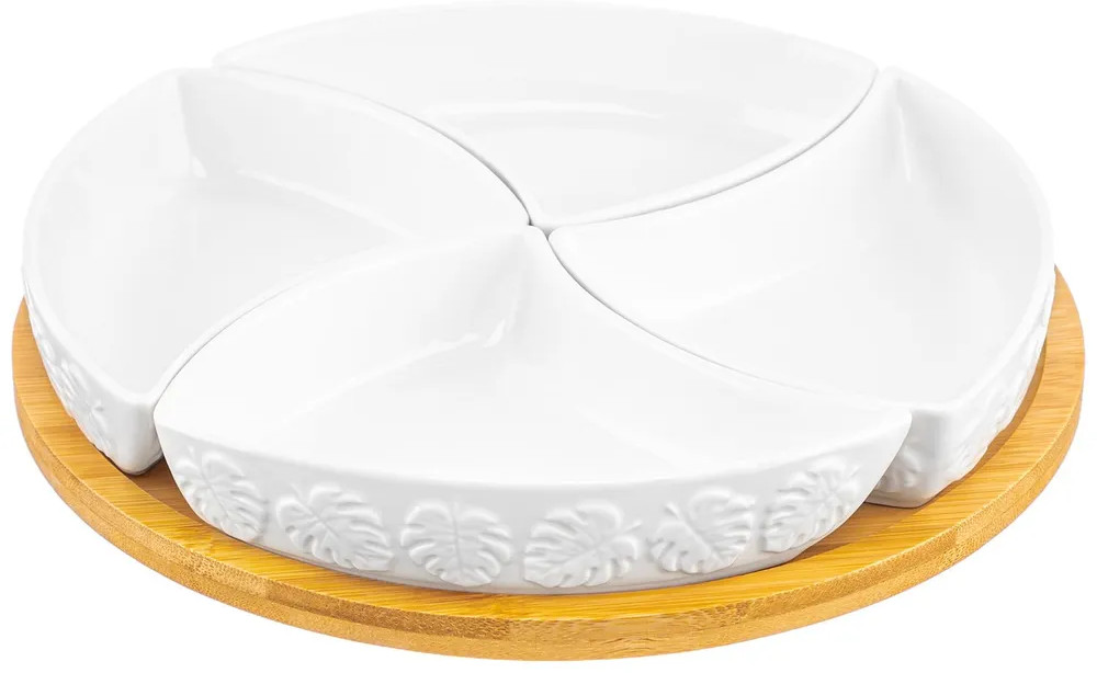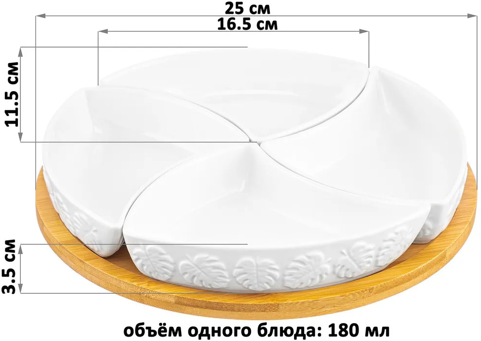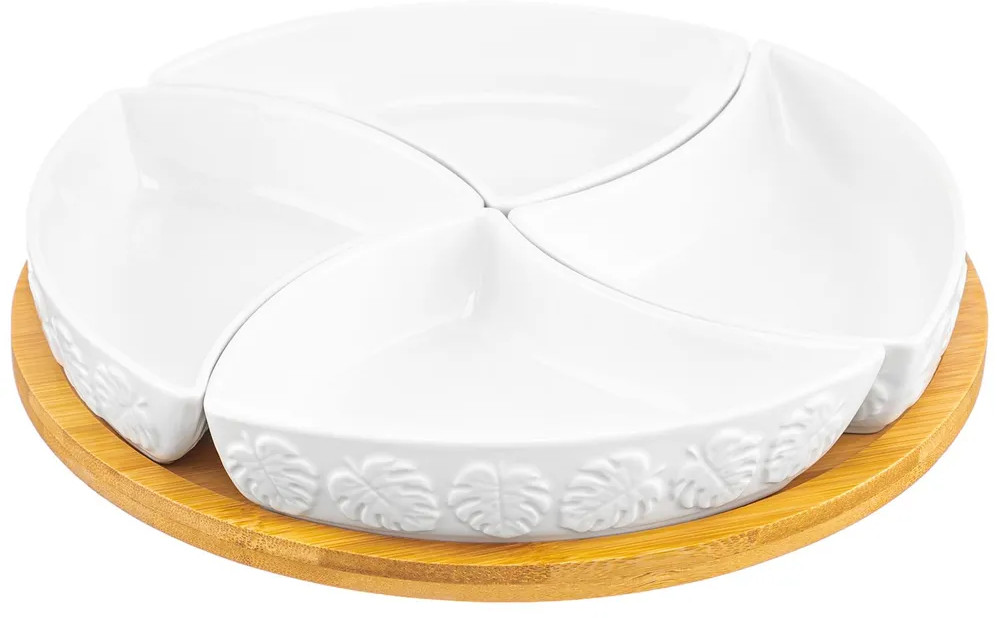 Elan Gallery Менажница на подставке «Тропики»красивый дизайн экономия места вращение удобство В данный момент этот товар отсутствует в продаже. Возможно, у нас найдется аналогичный или похожий товар здесь. Серия: Тропики Менажница Elan Gallery «Тропики» размером имеет четыре секции по 180 мл и крутящуюся подставку. Вращающаяся менажница подойдет для сервировки сыра, суши, роллов, конфет, разнообразных закусок и сладостей. Секции можно использовать по отдельности. Подойдет для сервировки сырного набора. Набор выполнен из высококачественного белого фарфора с декоративными рельефными узорами в виде листьев. Подставка выполнена из натурального бамбука. Фарфоровая посуда отличается от керамической повышенной плотностью. Фарфор не впитывает цвет продуктов и не деформируется от влаги, чему может быть подвержена керамика. Ёмкости без бамбуковой подставки можно использовать в микроволновой печи и посудомоечной машине. Подставку из бамбука нельзя замачивать. Набор поставляется в стильной картонной упаковке. Крутящееся сервировочное блюдо из серии посуды «Тропики» сможет стать настоящим украшением стола и элементом декора вашей кухни! |