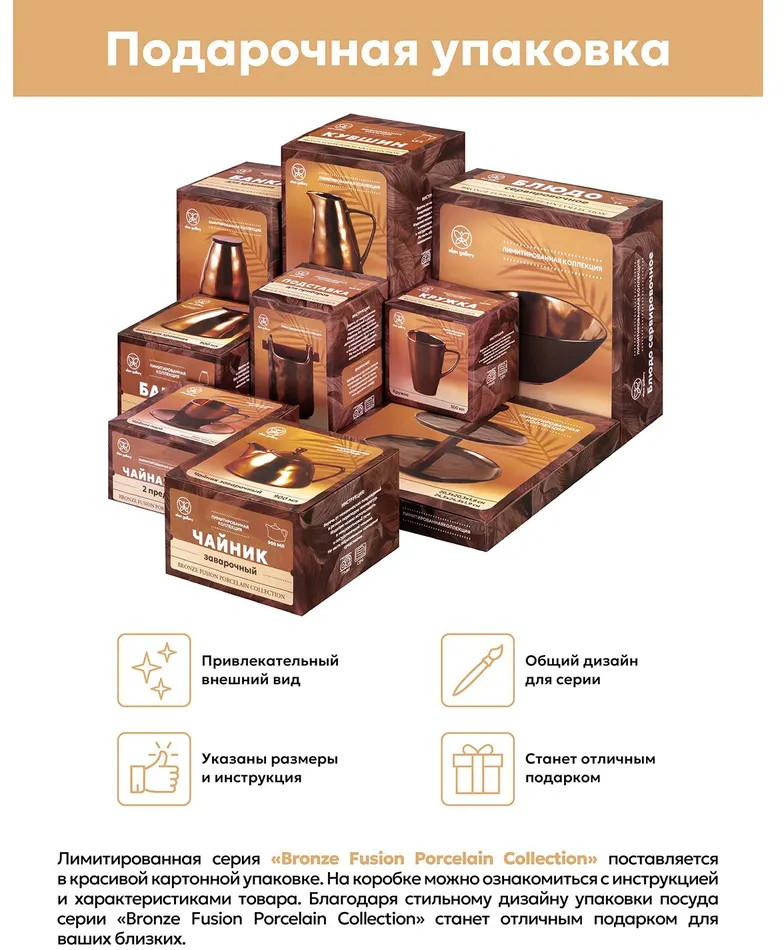 💳 Оплатить за товар можно при получении 🇰🇿 Есть бесплатная доставка по Казахстану от 1 дня 🎁 Копите бонусы с каждой покупки Серия: Bronze Кружка Elan Gallery «Бронза» выполнена из фарфора и станет стильным дополнением вашей кухни. Необычная геометрическая форма и бронзовый оттенок придают посуде лимитированной серии Bronze Fusion Porcelain Collection элегантный вид. Спокойный и гармоничный дизайн сочетает в себе прочность бронзы и изысканность фарфора. Кружка подходит ценителям чая и кофе, которые любят пить из красивой и необычной посуды. Это идеальный вариант для того, чтобы согреться горячим напитком зимой и освежиться прохладным лимонадом летом. Интересная кружечка с удобной ручкой украсит ваш стол своим стильным дизайном как на праздник, так и в будни. Можно использовать в микроволновой печи и мыть в посудомоечной машине. Поставляется в картонной упаковке. Кружка станет настоящим украшением вашего дома и чудесным подарком для любой женщины. Посуда лимитированной серии Bronze Fusion Porcelain Collection украсит кухонный интерьер и будет прекрасно сочетаться между собой! |