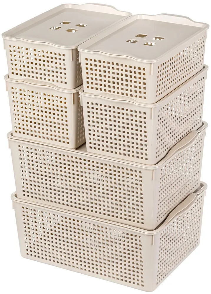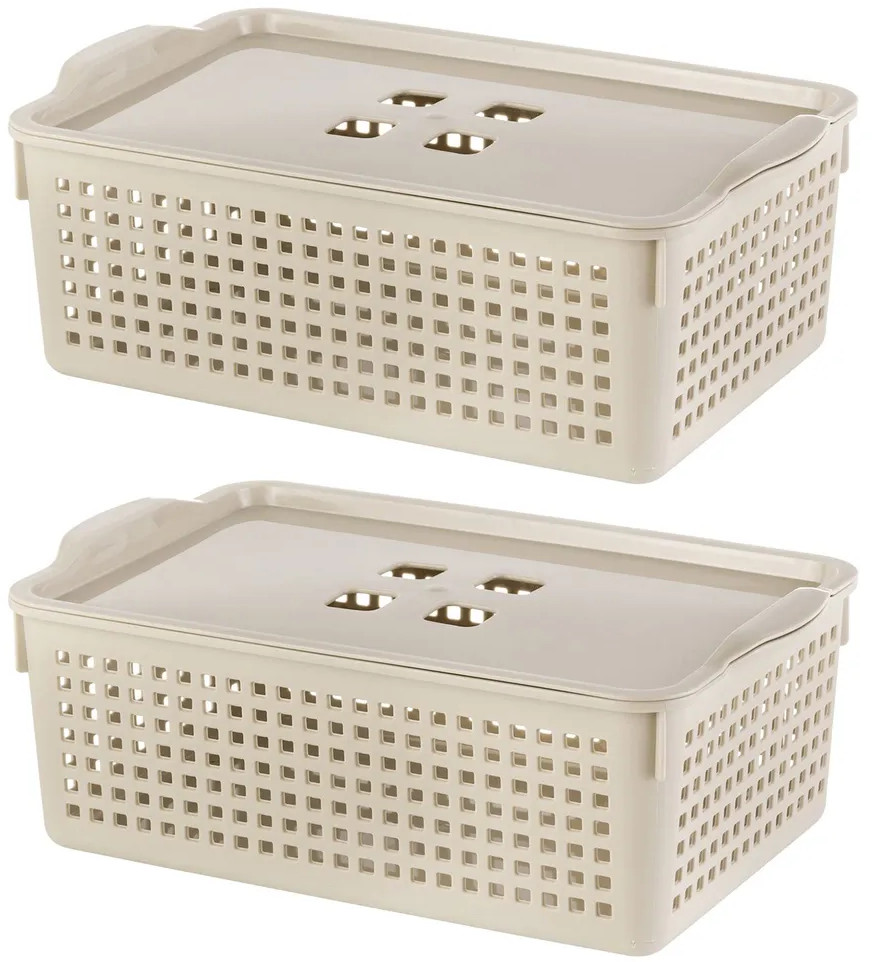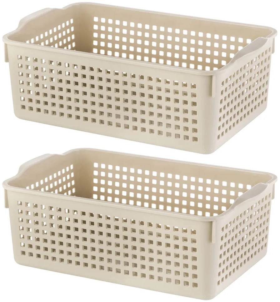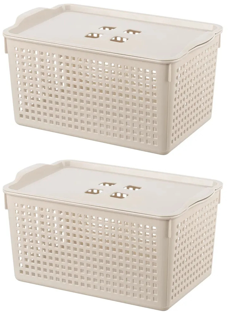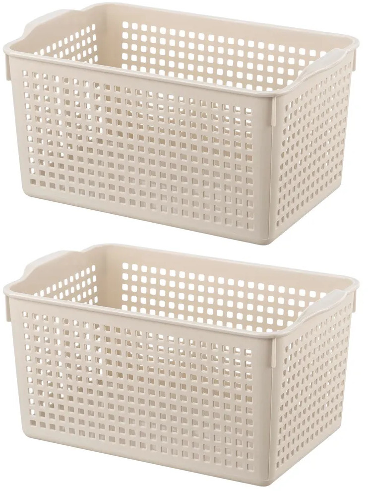 Органайзеры выполнены из полипропилена. Преимущество данного материала над обычным пластиком в том, что он легкий по весу и наиболее безопасный для здоровья. В универсальном контейнере цвета латте можно хранить как овощи и фрукты, так и кухонные и хозяйственные принадлежности. Используйте емкость для косметики, бытовой химии, моющих средств. Специальное плетение с дырочками позволяет воздуху проникать внутрь и не дает продуктам испортиться от недостатка кислорода.