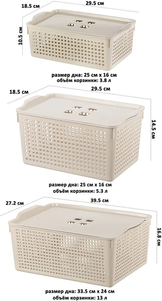 В состав набора входят: две корзины с крышкой объемом 5,3 литра (размер 29,5 × 18,5 × 14,5 см, дно 25 × 16 см), две корзины с крышкой 3,8 литра (размер 29,5 × 18,5 × 10,5 см, дно 25 × 16 см), две корзины с крышкой 13 литров (объем 39,5 × 27,2 × 16,8 см, дно 33,5 × 24 см).