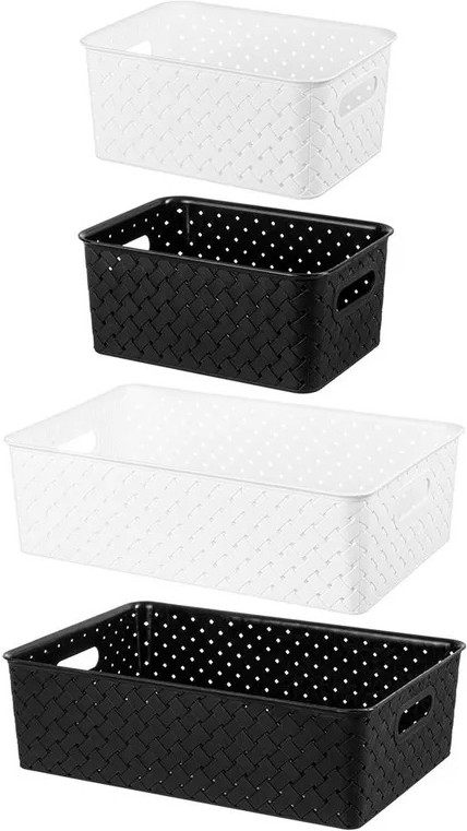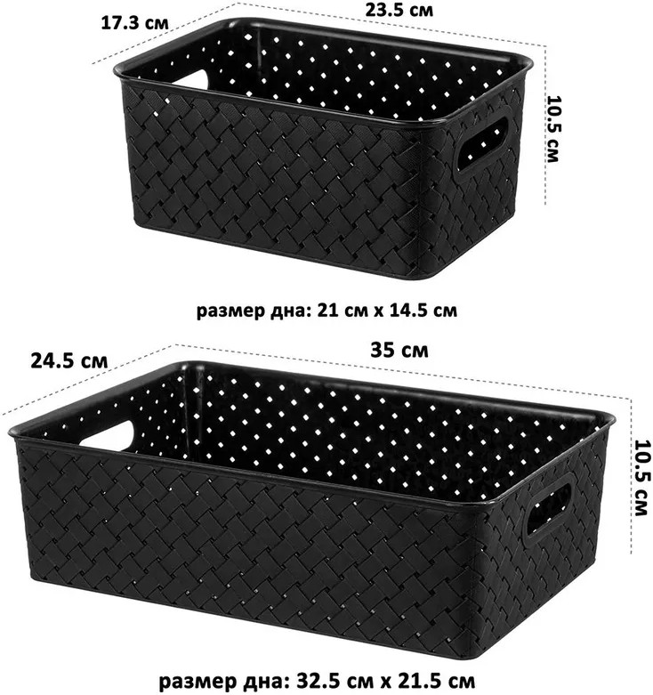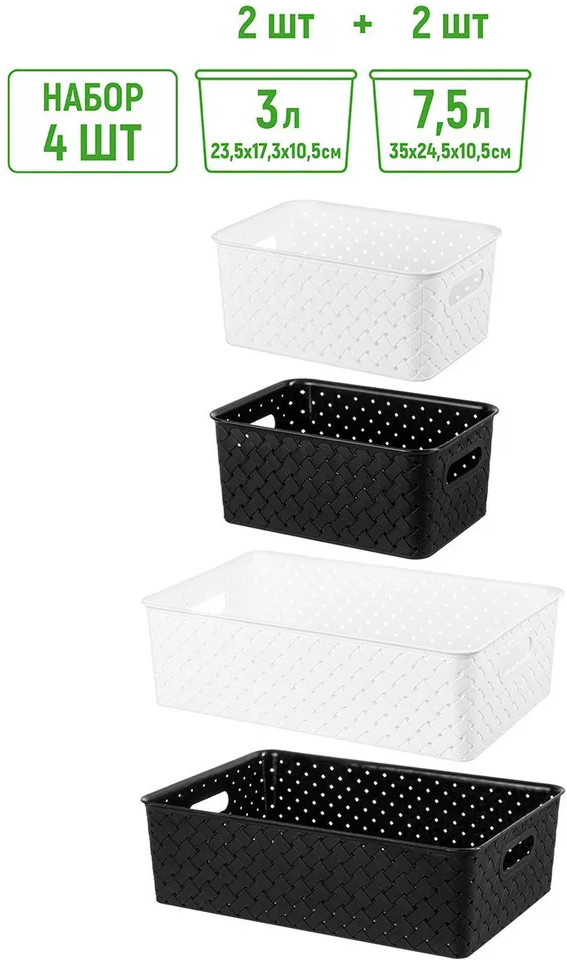 Набор из 4-х корзин с ручками (7,5 литра, 3 литра) можно разместить на кухне, в ванной, прихожей, офисе, гараже или в шкафу. Большие коробки подойдут для бытовой химии, игрушек, одежды (для шапок, перчаток, белья, носков), а маленькие корзинки — для канцелярии, косметики, украшений, рукоделия (для пряжи, вязания) и других мелочей. Контейнеры 7,5 литра подойдут для документов и бумаги А4. Корзины выполнены из пищевого полипропилена и украшены декоративными рельефными узорами с отверстиями для вентиляции.