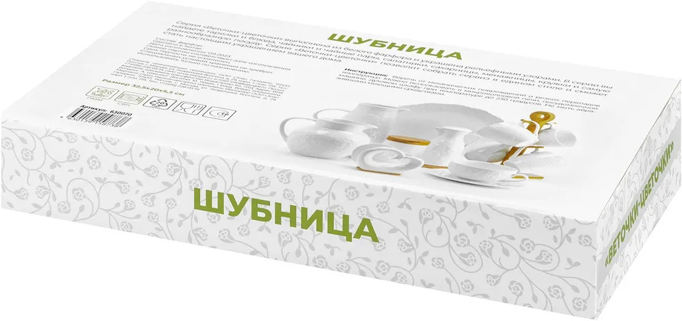 Elan Gallery Блюдо-шубница «Веточки-цветочки»В данный момент этот товар отсутствует в продаже. Возможно, у нас найдется аналогичный или похожий товар здесь. Серия: Веточки-цветочки Шубница Elan Gallery «Веточки-цветочки» объёмом выполнена из белого фарфора в классическом дизайне. Подойдет для подачи сельди под шубой, салатов или плова. Внутренний размер шубницы — 26 × 18,5 см. Можно использовать для сервировки нарезки, овощей или фруктов для большого количества гостей. Посуда серии украшена рельефным узором в виде изящных веточек с маленькими цветочками. Эргономичная форма поможет в приготовлении холодца, желе или мороженого. Можно использовать как форму для запекания. Фарфоровая посуда отличается от керамической повышенной плотностью. Фарфор не впитывает цвет продуктов и не деформируется от влаги, чему может быть подвержена керамика. Не рекомендуется применять абразивные моющие средства. Можно использовать в микроволновой печи и мыть в посудомоечной машине. Станет отличным подарком для любой хозяйки, которая ценит стильную сервировку. Понравится любителям посуды в скандинавском стиле. Серия «Веточки-цветочки» позволит собрать сервиз в едином стиле и сможет стать настоящим украшением вашего дома. |