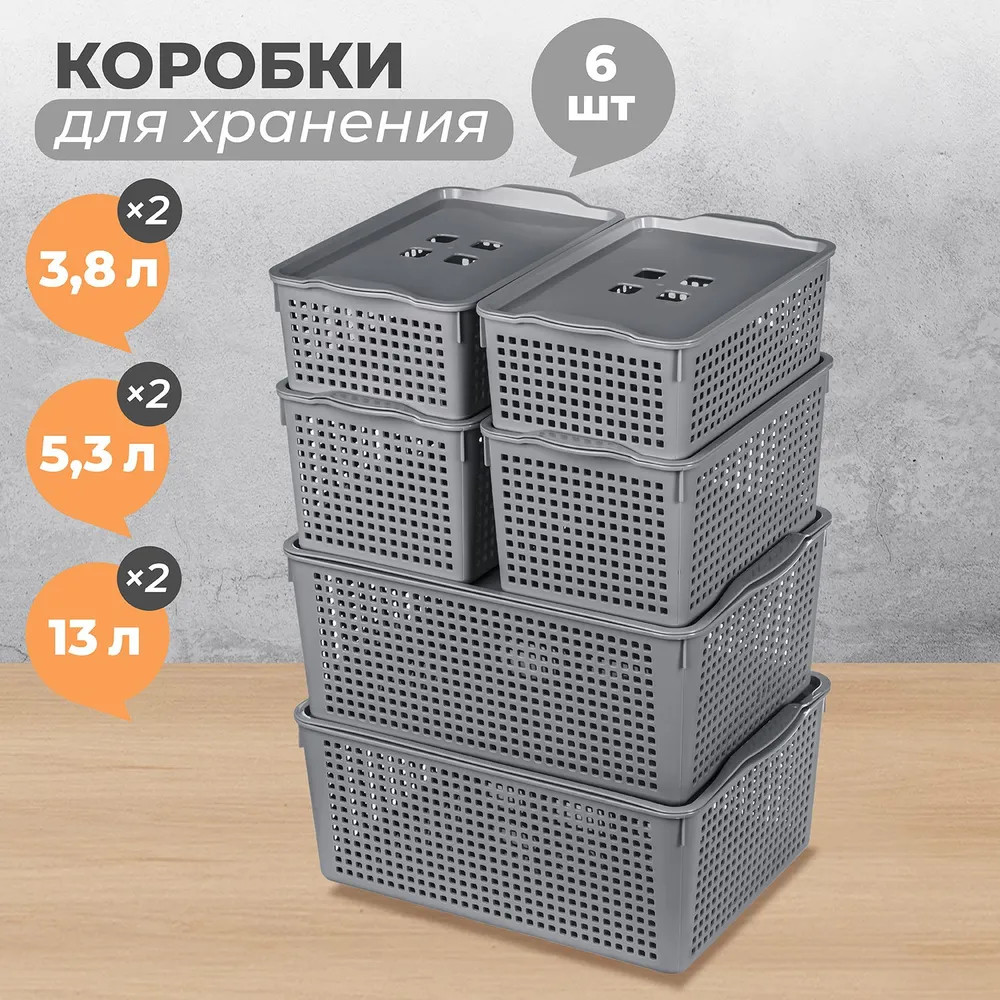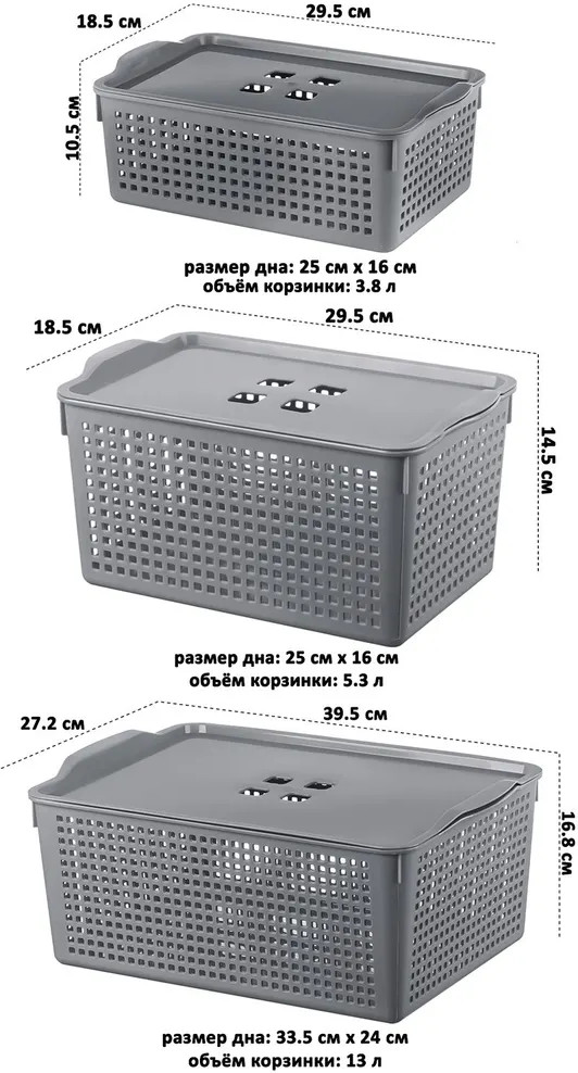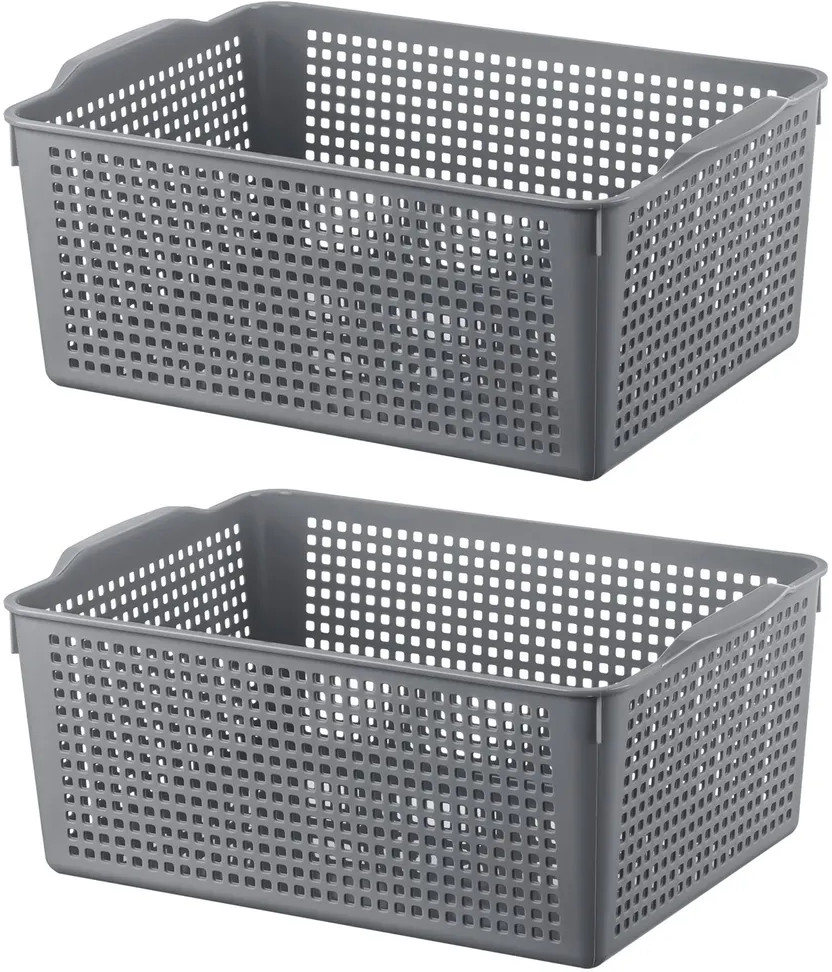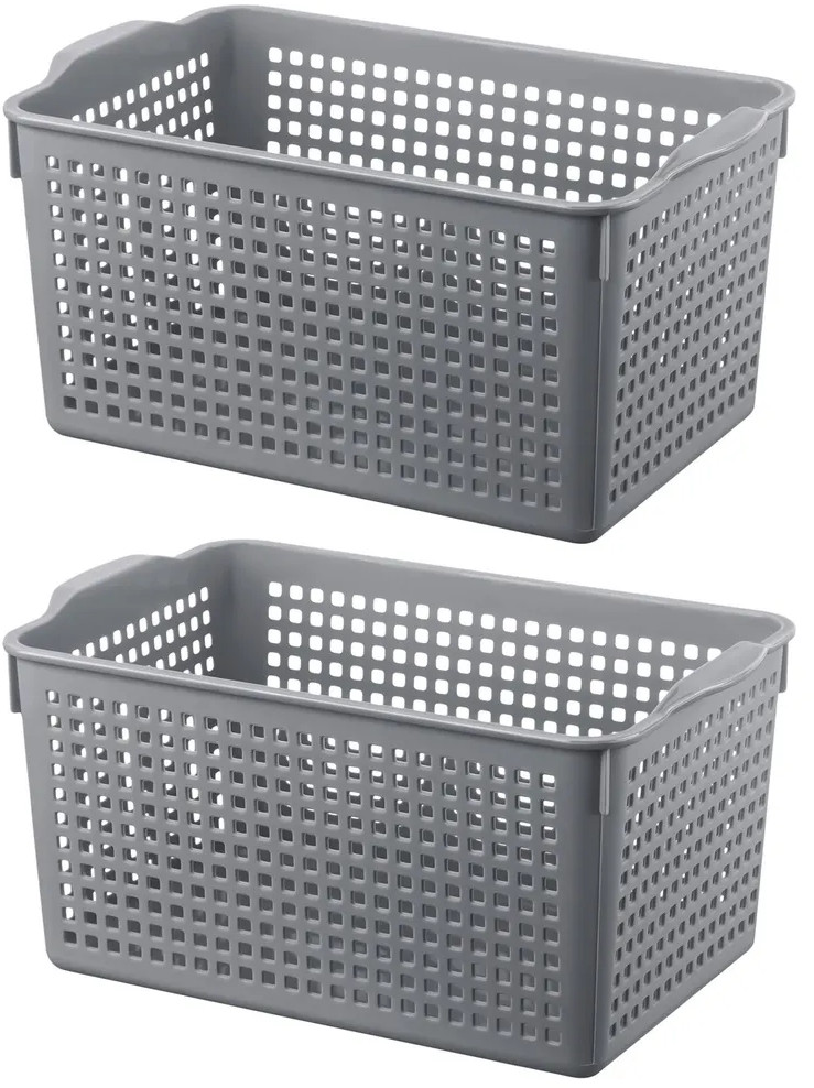 Органайзеры выполнены из полипропилена. Преимущество данного материала над обычным пластиком в том, что он легкий по весу и наиболее безопасный для здоровья. В универсальном контейнере серого цвета можно хранить как овощи и фрукты, так и кухонные и хозяйственные принадлежности. Используйте емкость для косметики, бытовой химии, моющих средств. Специальное плетение с дырочками позволяет воздуху проникать внутрь и не дает продуктам испортиться от недостатка кислорода. Корзина может быть использована для белья, полотенец и хранения различных мелочей. Такую подставку можно поставить под раковину в ванной, возле стиральной машины или на полку. Ящички можно хранить компактно — один в другом. Используйте в детской комнате как стеллаж или ящик для игрушек. Товары представлены разных объемов, форм и расцветок, что позволит собрать уникальный набор, подходящий под ваши потребности.