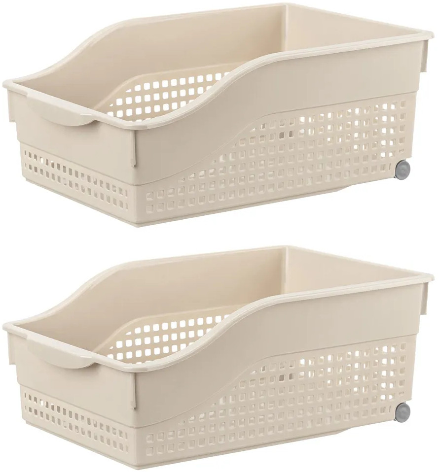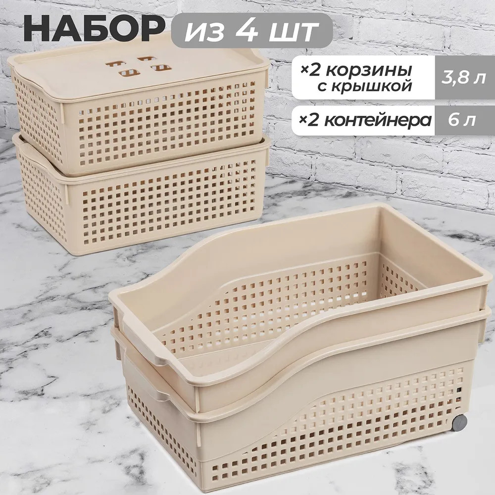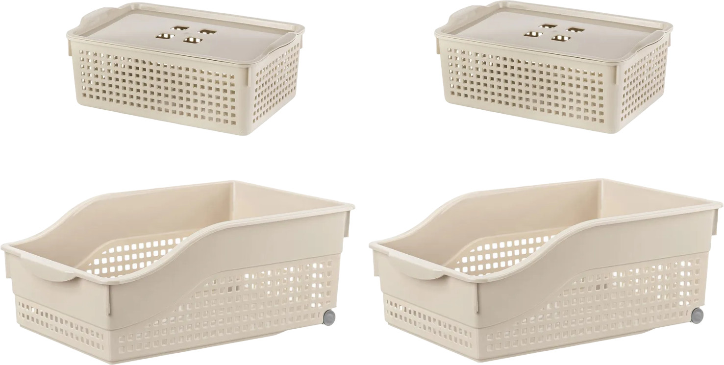 Органайзеры выполнены из полипропилена. Преимущество данного материала над обычным пластиком в том, что он легкий по весу и наиболее безопасный для здоровья. В универсальном контейнере цвета латте можно хранить как овощи и фрукты, так и кухонные и хозяйственные принадлежности. Используйте емкость для косметики, бытовой химии, моющих средств. Специальное плетение с дырочками позволяет воздуху проникать внутрь и не дает продуктам испортиться от недостатка кислорода. Корзина может быть использована для белья, полотенец и хранения различных мелочей. Такую подставку можно поставить под раковину в ванной, возле стиральной машины или на полку. Ящички можно хранить компактно — один в другом. Используйте в детской комнате как стеллаж или ящик для игрушек. Товары представлены разных объемов, форм и расцветок, что позволит собрать уникальный набор, подходящий под ваши потребности.