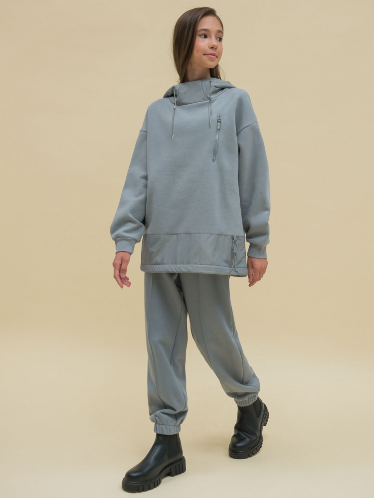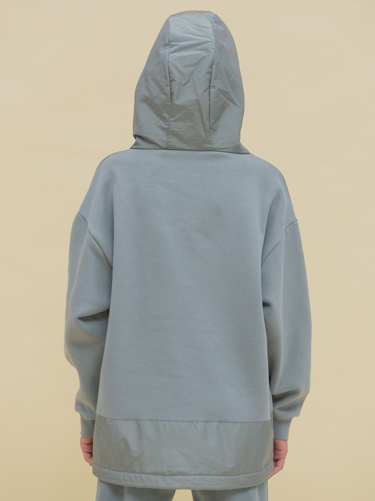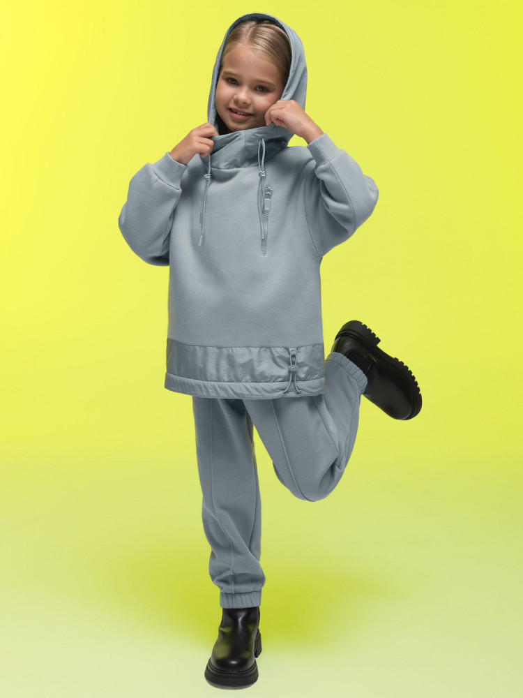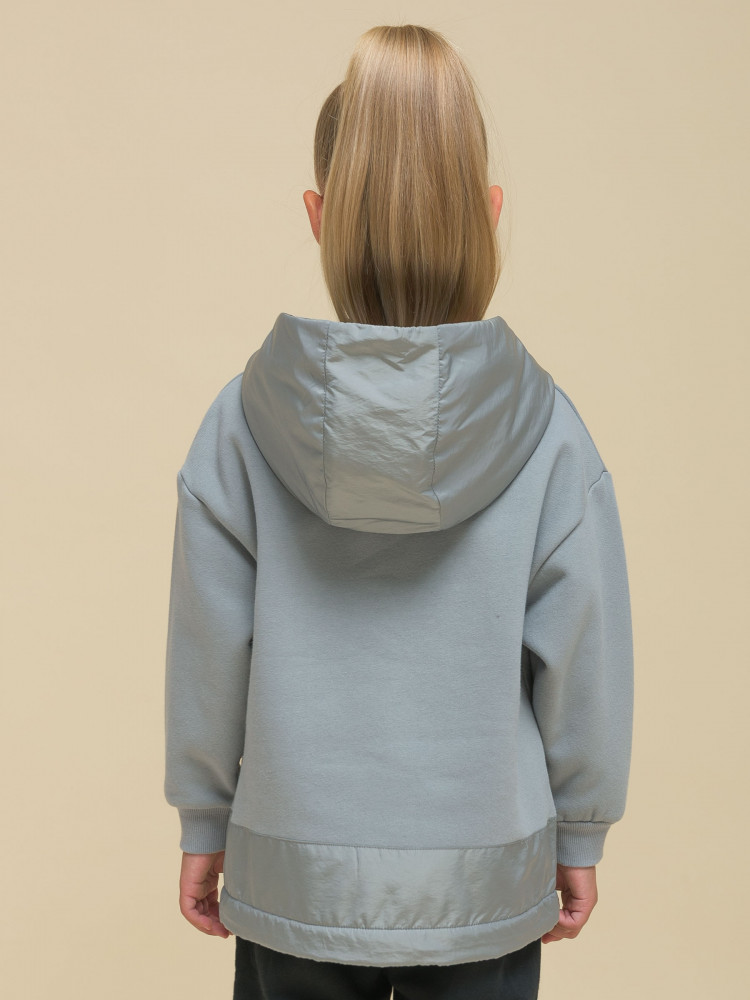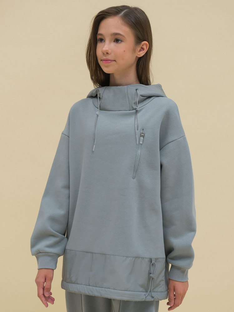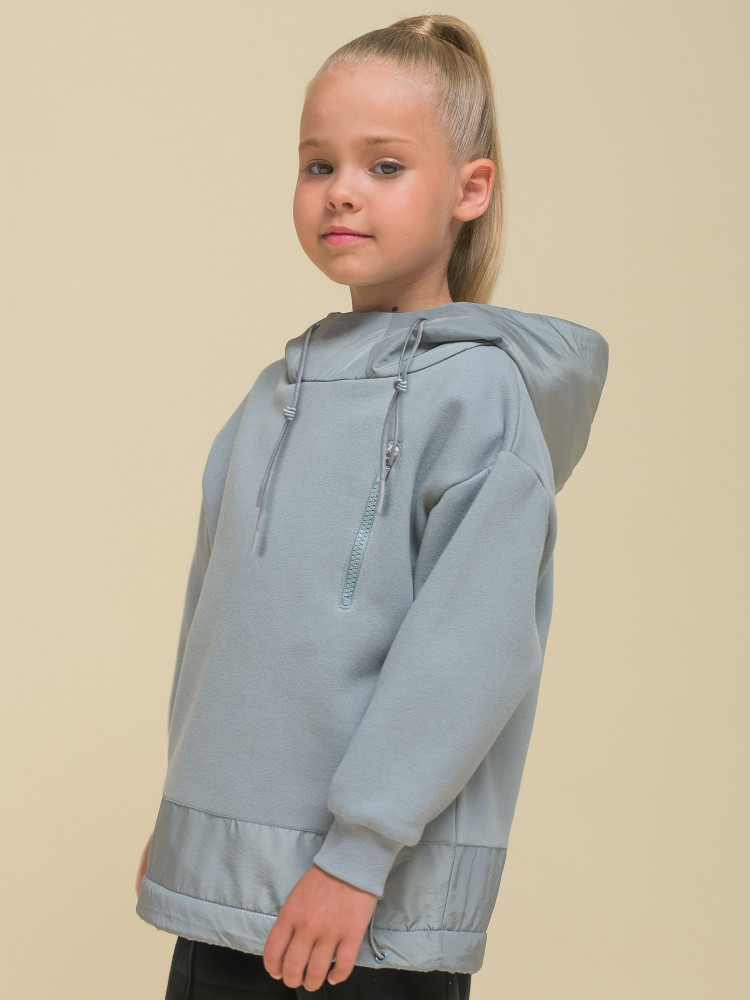 Худи детское для девочки. Толстовка выполнена в сочетании двух материалов: футера с начёсом и гладкой курточной ткани. Это супермодный тренд. Капюшон и отделка по низу изделия из курточной ткани — максимум практичности. Ребёнок не промокнет, а декоративная притачная полоса не будет мараться при частой носке. Худи для девочек актуального оверсайз-силуэта со спущенным плечом подарит ребёнку комфорт и свободу движения. Высокий воротник защищает шею от холода и ветра. По низу рукавов манжеты из эластичной рибаны (ткань в рубчик), они не растягиваются и сохраняют форму и прекрасный внешний вид надолго. Слева на груди прорезной карман на молнии — удобно спрятать телефон. Капюшон с двумя швами, что обеспечивает анатомически правильную форму и комфортную посадку по голове. Объём капюшона регулируется тесьмой. Двойной капюшон — швы закрыты, смотрится аккуратно. По низу модели кулиска для регулировки объёма эластичным шнуром, фиксатор шнура расположен слева.
