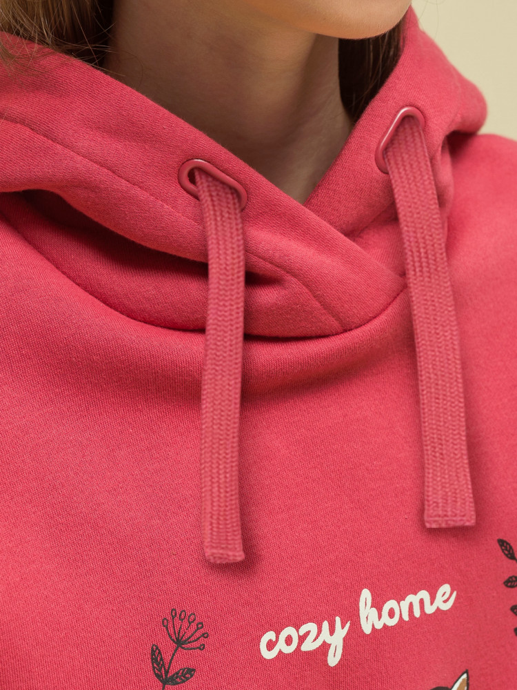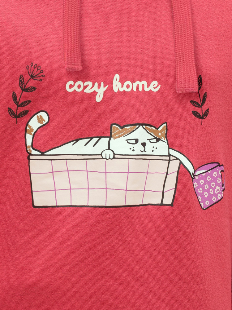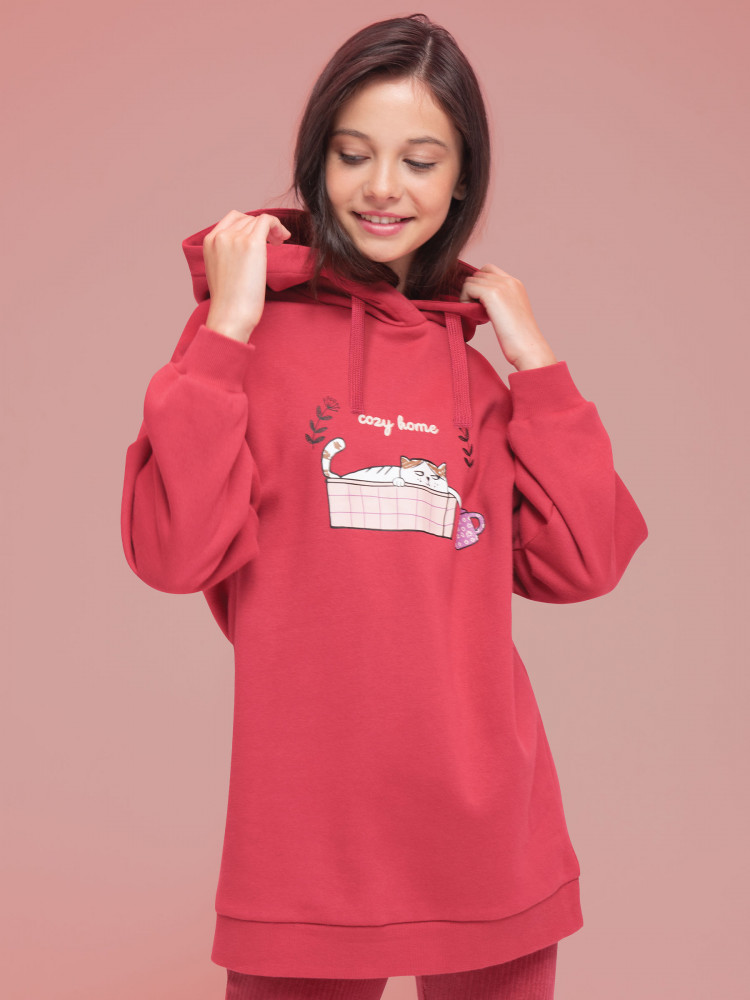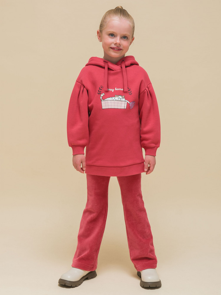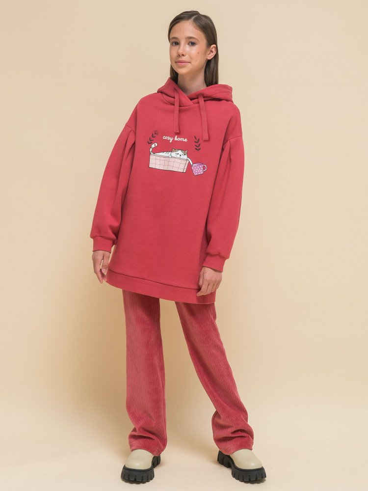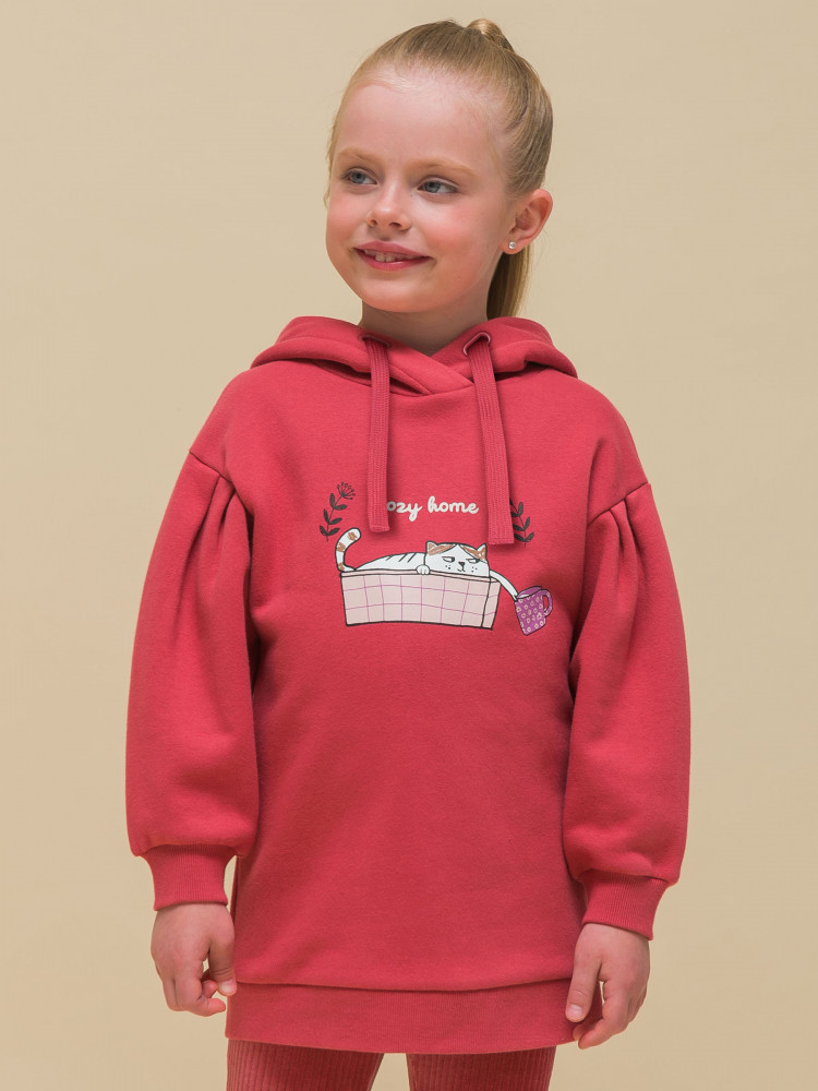Худи оверсайз с принтом на груди. Принт эластичный и прочный, без проблем переносит частые стирки. Милый принт изображает котика в корзине с чашкой, надпись переводится: «уютный дом». Худи для девочек неприхотливо в уходе. В составе ткани преобладает высококачественный хлопок — толстовка мягкая и прекрасно пропускает воздух, давая коже ребёнка дышать. Благодаря полиэстеру изделие легко стирается и быстро сохнет, сохраняет первозданную форму надолго. Туника представлена в двух трендовых цветах: красный и зелёный (оттенок хаки).
