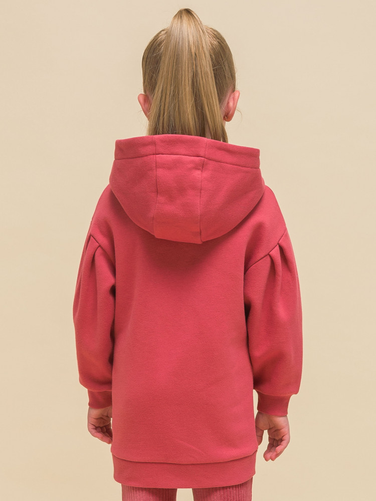 Худи детское удлиненное для девочки. Туника актуального оверсайз-силуэта со спущенным плечом подарит ребёнку комфорт и свободу движения. На рукавах красивые глубокие складки. Объёмные рукава — один из модных трендов сезона. По низу изделия и низу рукавов манжеты из эластичной рибаны (ткань в рубчик), они не растягиваются и сохраняют форму и отличный внешний вид надолго. Капюшон с двумя швами, что обеспечивает анатомически правильную форму и комфортную посадку по голове. Объём капюшона регулируется тесьмой, продетой в крупные люверсы. Капюшон двойной — швы не видно.