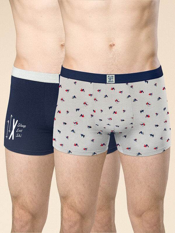 Боксеры в спортивном стиле представлены в двух цветах — однотонном светло-синем и в голубом с мелким рисунком по мотивам активный лыжный спорт, в одной цветовой сдержанной гамме. Удачный вариант как подарочный набор для мужчины трусы с надписью It’s the season (Это сезон…) — на бирке и надписью сбоку Sleep, Eat, Sky (Спать, есть, кататься на лыжах), тематическим рисунком — лыжи, горы, зима.