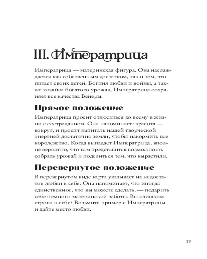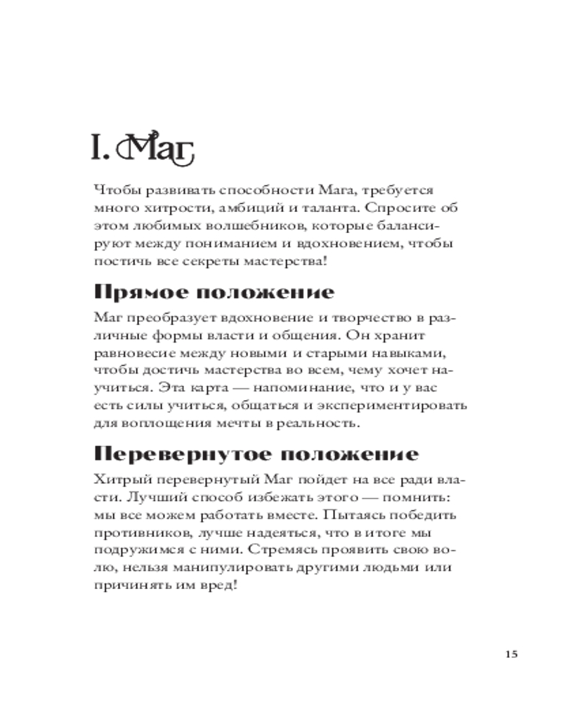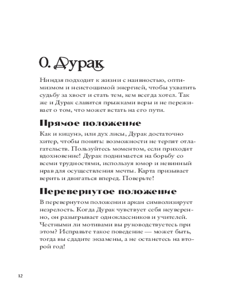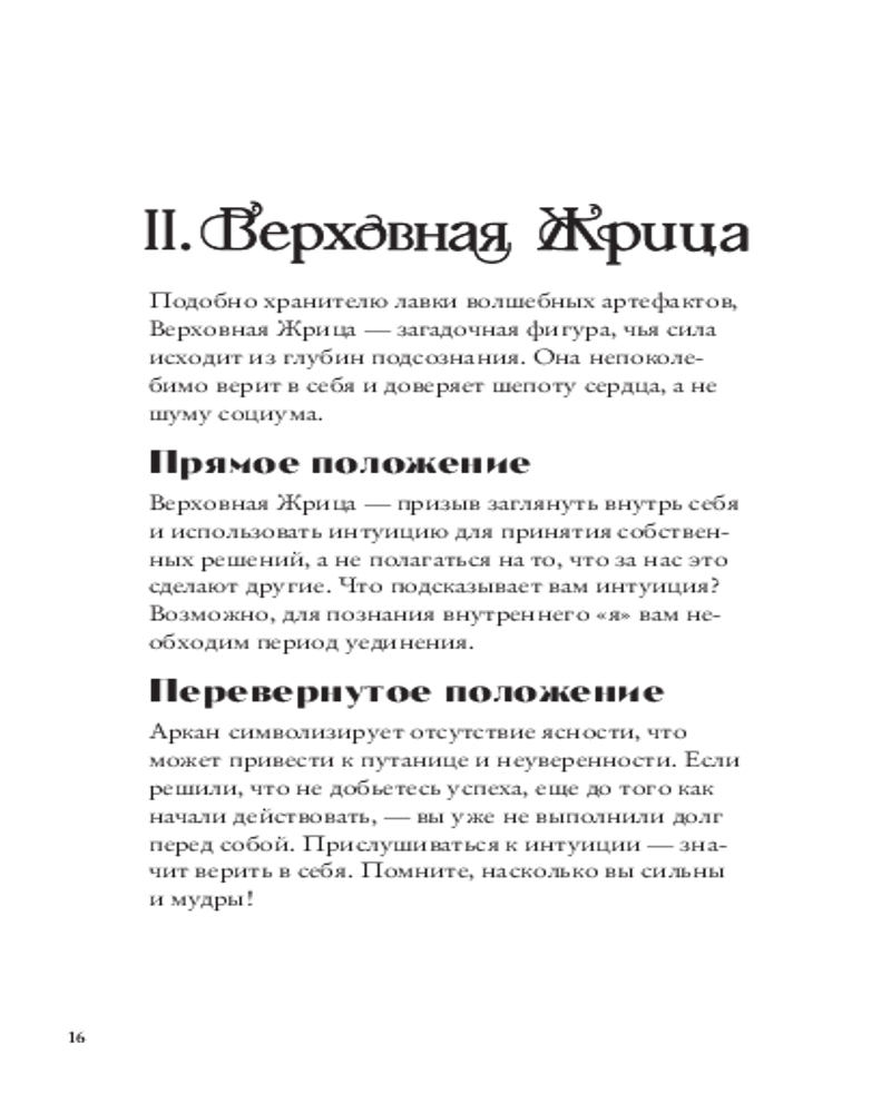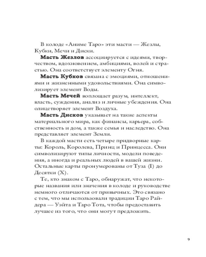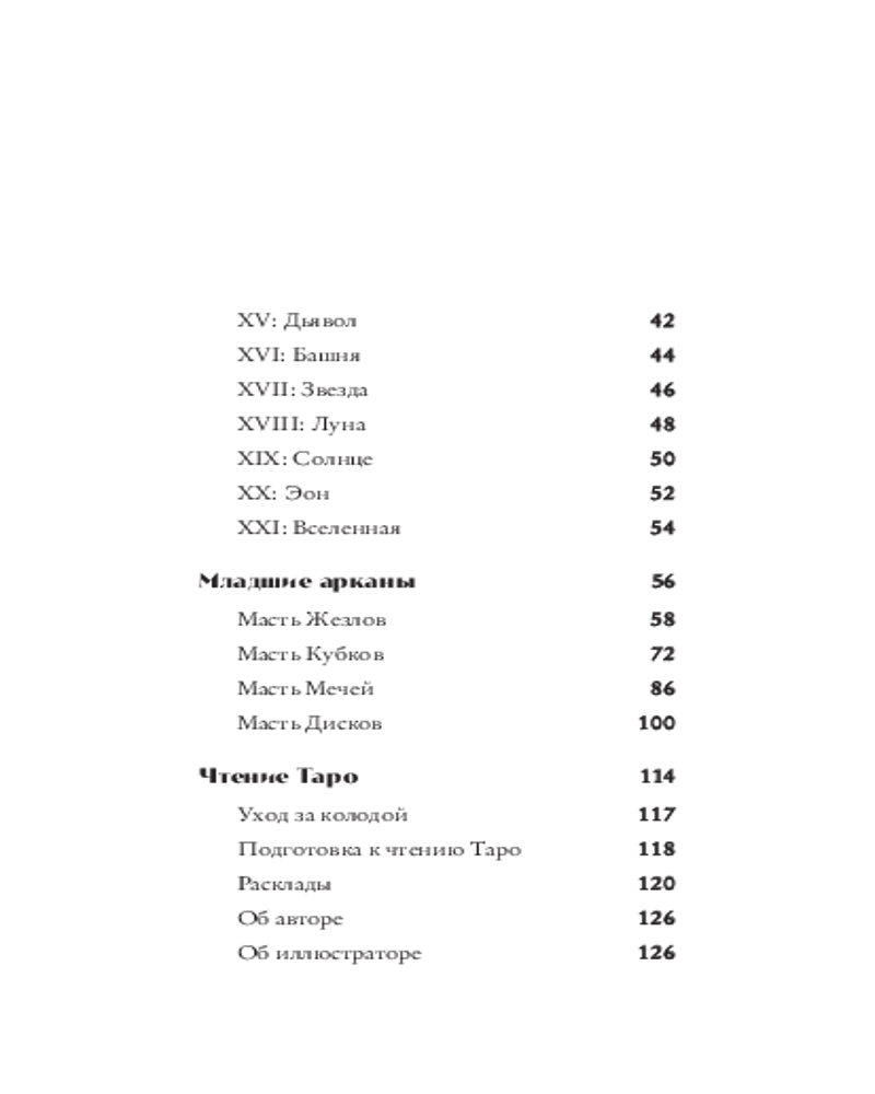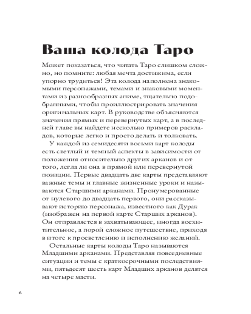 • руководство: цветных 128 страниц с прямыми и перевернутыми значениями арканов, простыми раскладами и советами по работе с колодой;