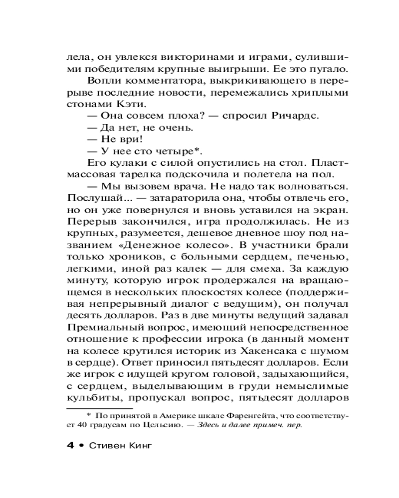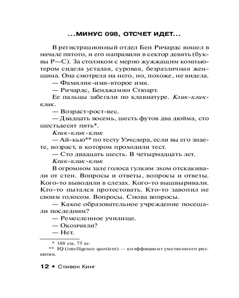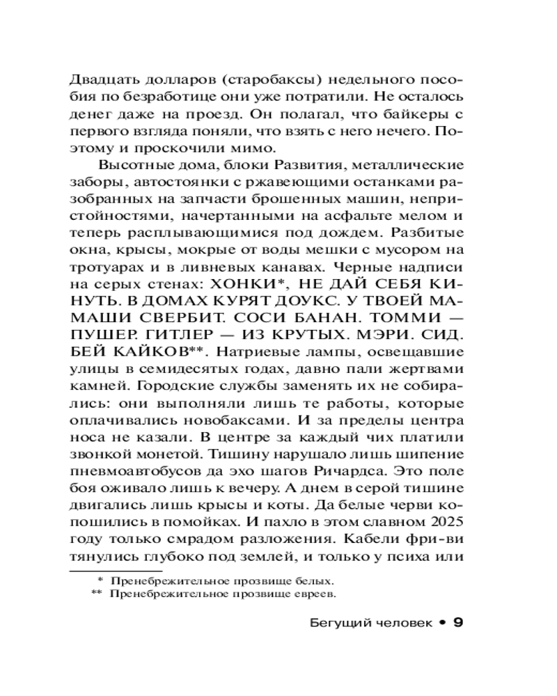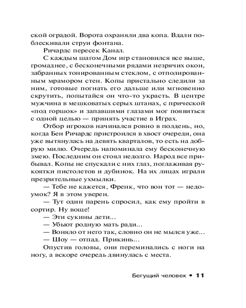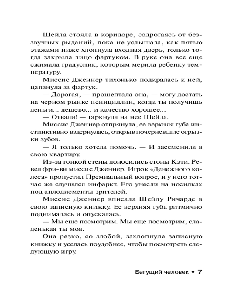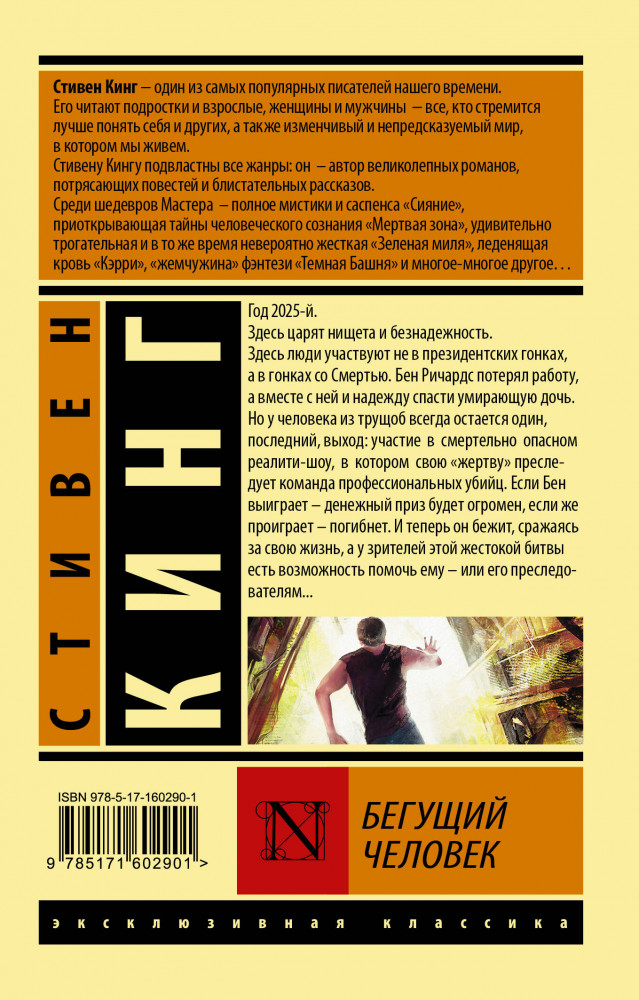 💳 Оплатить за товар можно при получении 🇰🇿 Есть бесплатная доставка по Казахстану от 1 дня 🎁 Копите бонусы с каждой покупки Серия: Эксклюзивная классика Год 2025-й. Здесь царит нищета и безнадежность. Здесь люди участвуют не в президентских гонках, а в гонках со Смертью. Бен Ричардс потерял работу, а вместе с ней и надежду спасти умирающую дочь. Но у человека из трущоб всегда остается один, последний, выход: участие в смертельно опасном реалити-шоу, в котором свою «жертву» преследует команда профессиональных убийц. Если Бен выиграет — денежный приз будет огромен, если же проиграет — погибнет. И теперь он бежит, сражаясь за свою жизнь, а у зрителей этой жестокой битвы есть возможность помочь ему — или его преследователям... |