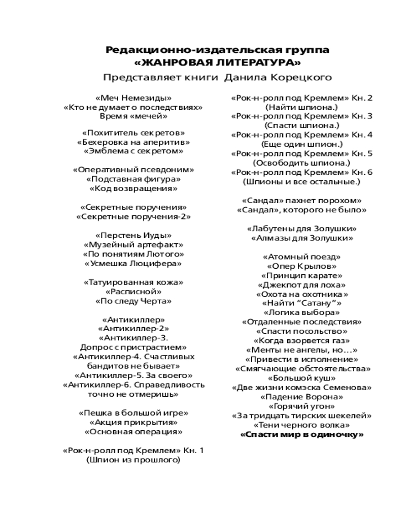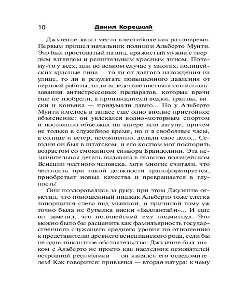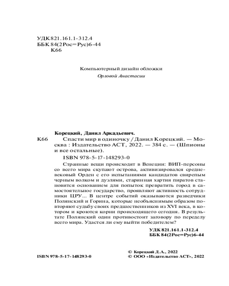 💳 Оплатить за товар можно при получении 🇰🇿 Есть бесплатная доставка по Казахстану от 1 дня 🎁 Копите бонусы с каждой покупки Серия: Шпионы и все остальные. Данил Корецкий (м) Странные вещи происходят в Венеции: ВИП-персоны со всего мира скупают острова, активизировался средневековый Орден с его испытаниями кандидатов свирепым черным волком и дуэлями, старинная хартия пиратов становится основанием для попыток превратить город в самостоятельное государство, проявляют активность сотрудники ЦРУ... В центре событий оказываются разведчики Полянский и Горина, которые необъяснимым образом повторяют судьбу своих предшественников из 16 века, в котором и кроются корни происходящего сегодня. В результате Полянский один противостоит заговору по переделу всего мира. Удастся ли ему выйти победителем? |