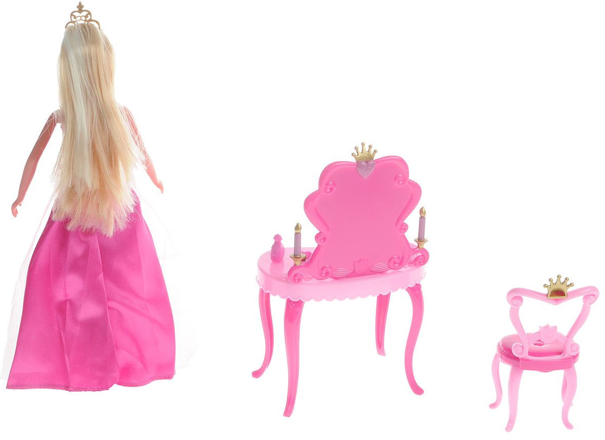 В набор входит изящный столик с изогнутыми ножками и зеркалом в красивой раме и розовый стульчик. Мебель этого набора выполнена в королевском стиле барокко, основу которого составляет мастерское использование завитков и плавных изогнутых линей. На столе можно расположить множество аксессуаров и косметических принадлежностей. Благодаря этому набору девочка сможет поухаживать за любимой куклой-принцессой, наслаждаясь увлекательным процессом игры. Благодаря играм с куклой ваша малышка сможет развить фантазию и любознательность, овладеть навыками общения и научиться ответственности, а дополнительные аксессуары сделают игру еще увлекательнее.